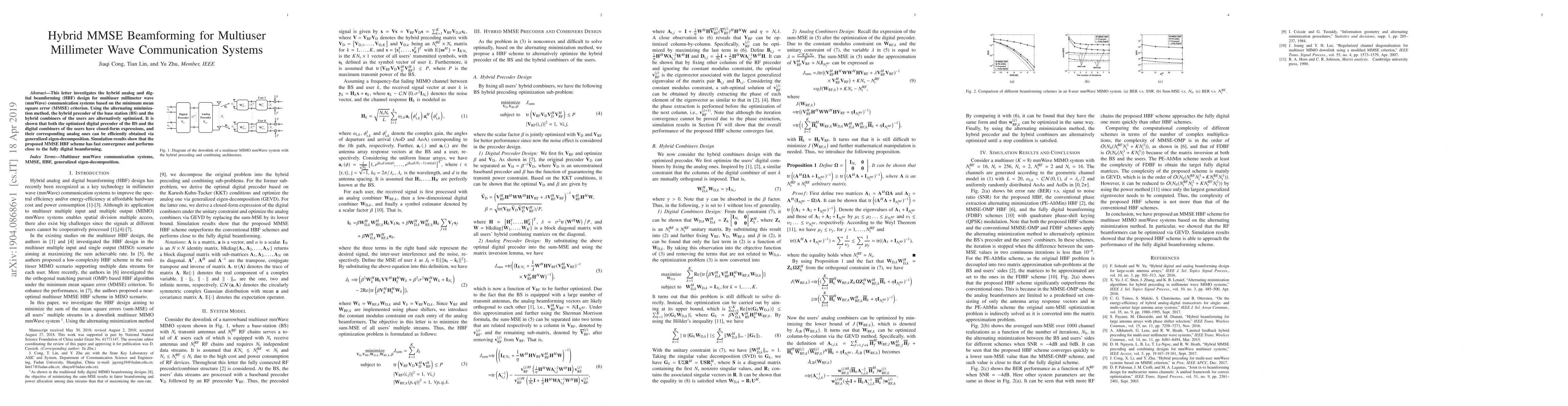 This paper proposes a hybrid MMSE beamforming design for multiuser mmWave systems, optimizing both the base station precoder and user combiners using alternating minimization. The optimized digital components have closed-form expressions, with efficient analog counterparts derived via eigen-decomposition, achieving fast convergence and performance close to fully digital beamforming.