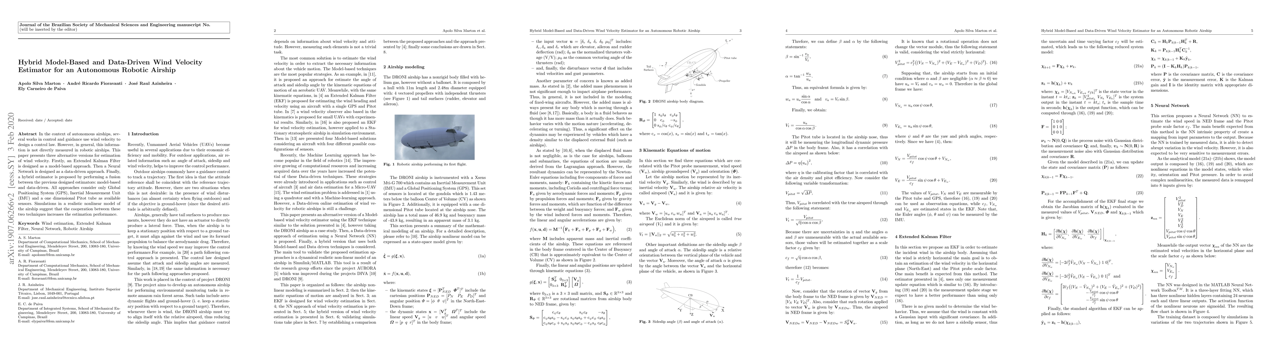 This paper proposes three wind velocity estimation methods for an autonomous robotic airship: an Extended Kalman Filter (model-based), a Neural Network (data-driven), and a hybrid fusion of both. Simulation results show that the hybrid approach improves estimation performance compared to individual methods.