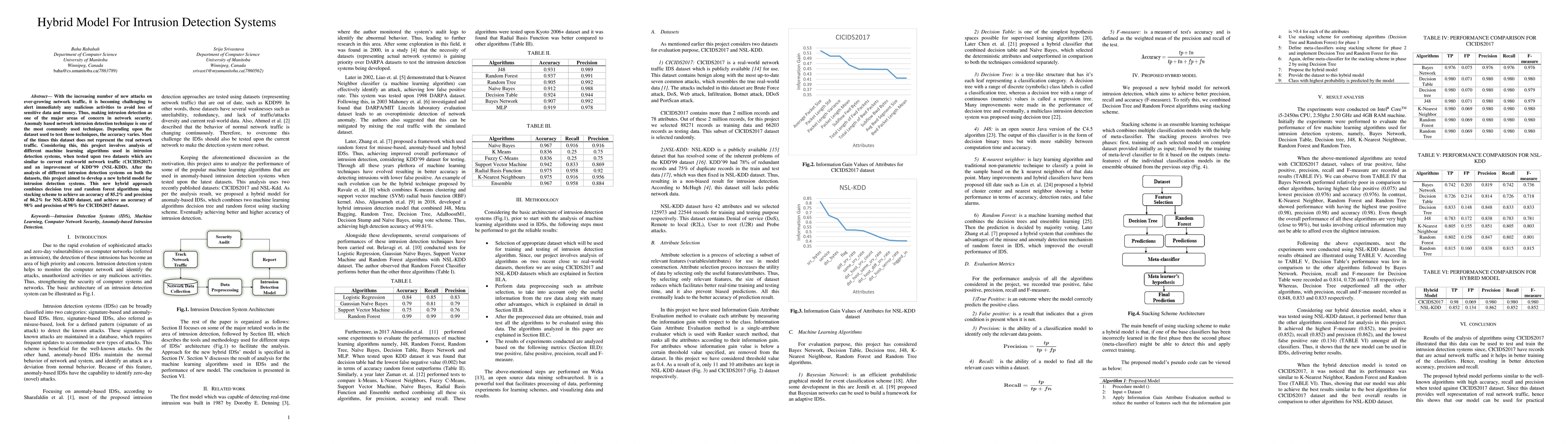 With the increasing number of new attacks on ever growing network traffic, it is becoming challenging to alert immediately any malicious activities to avoid loss of sensitive data and money. This is making intrusion detection as one of the major areas of concern in network security. Anomaly based network intrusion detection technique is one of the most commonly used technique. Depending upon the dataset used to test those techniques, the accuracy varies. Most of the times this dataset does not represent the real network traffic. Considering this, this project involves analysis of different machine learning algorithms used in intrusion detection systems, when tested upon two datasets which are similar to current real world network traffic(CICIDS2017) and an improvement of KDD 99 (NSL-KDD). After the analysis of different intrusion detection systems on both the datasets, this project aimed to develop a new hybrid model for intrusion detection systems. This new hybrid approach combines decision tree and random forest algorithms using stacking scheme to achieve an accuracy of 85.2% and precision of 86.2% for NSL-KDD dataset, and achieve an accuracy of 98% and precision of 98% for CICIDS2017 dataset.