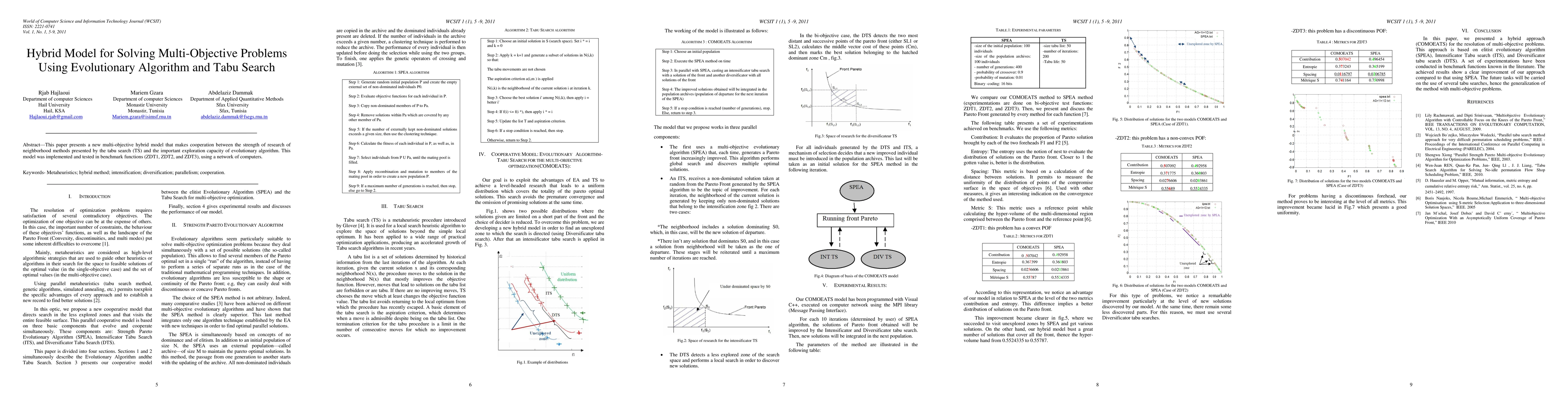 This paper introduces a hybrid model combining evolutionary algorithms and tabu search to solve multi-objective problems, leveraging the strengths of both methods. The proposed model was tested on benchmark functions ZDT1, ZDT2, and ZDT3 using a distributed computing network.