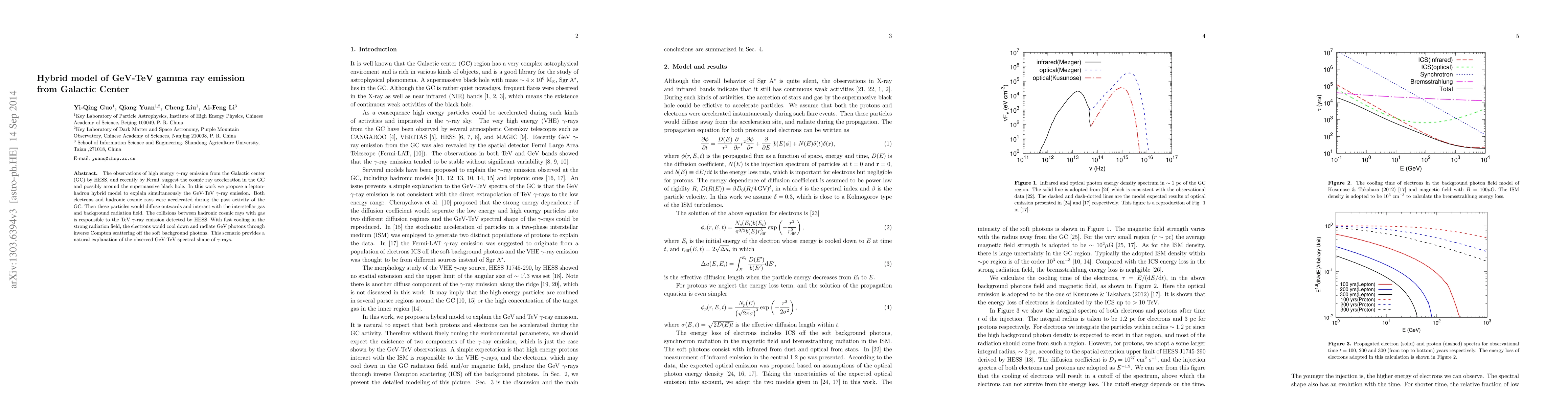 This paper proposes a hybrid model combining both leptonic and hadronic processes to explain the GeV-TeV gamma-ray emission from the Galactic Center, suggesting cosmic ray acceleration and interactions with interstellar gas and radiation fields. The model attributes TeV gamma rays to hadronic cosmic ray collisions and GeV gamma rays to electron inverse Compton scattering.