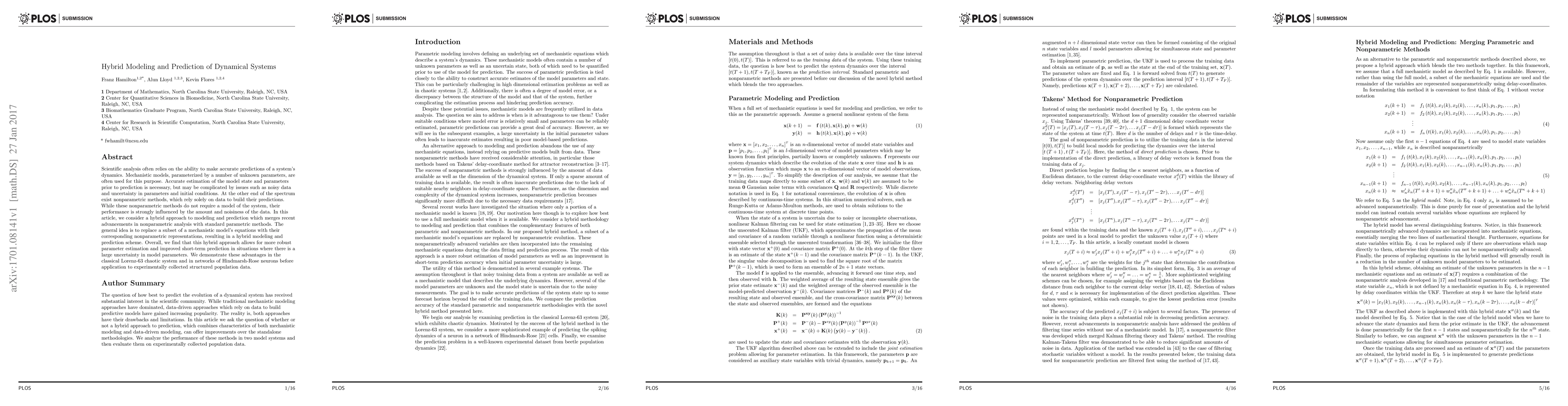 Scientific analysis often relies on the ability to make accurate predictions of a system's dynamics. Mechanistic models, parameterized by a number of unknown parameters, are often used for this purpose. Accurate estimation of the model state and parameters prior to prediction is necessary, but may be complicated by issues such as noisy data and uncertainty in parameters and initial conditions. At the other end of the spectrum exist nonparametric methods, which rely solely on data to build their predictions. While these nonparametric methods do not require a model of the system, their performance is strongly influenced by the amount and noisiness of the data. In this article, we consider a hybrid approach to modeling and prediction which merges recent advancements in nonparametric analysis with standard parametric methods. The general idea is to replace a subset of a mechanistic model's equations with their corresponding nonparametric representations, resulting in a hybrid modeling and prediction scheme. Overall, we find that this hybrid approach allows for more robust parameter estimation and improved short-term prediction in situations where there is a large uncertainty in model parameters. We demonstrate these advantages in the classical Lorenz-63 chaotic system and in networks of Hindmarsh-Rose neurons before application to experimentally collected structured population data.