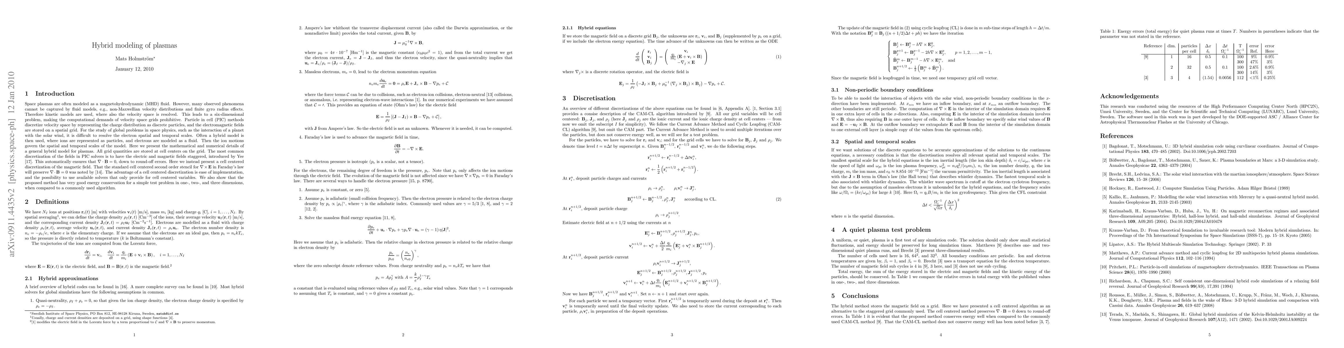 Here we present the mathematical and numerical details of a general hybrid model for plasmas. All grid quantities are stored at cell centers on the grid. The most common discretization of the fields in PIC solvers is to have the electric and magnetic fields staggered, introduced by Yee. This automatically ensures that div(B)=0, down to round-off errors. Here we instead present a cell centered discretization of the magnetic field. That the standard cell centered second order stencil for rot(E) in Faraday's law will preserve div(B)=0 was noted by Toth. The advantage of a cell centered discretization is ease of implementation, and the possibility to use available solvers that only handle cell centered variables. We also show that the proposed method has very good energy conservation for a simple test problem in three dimensions, when compared to a commonly used algorithm.