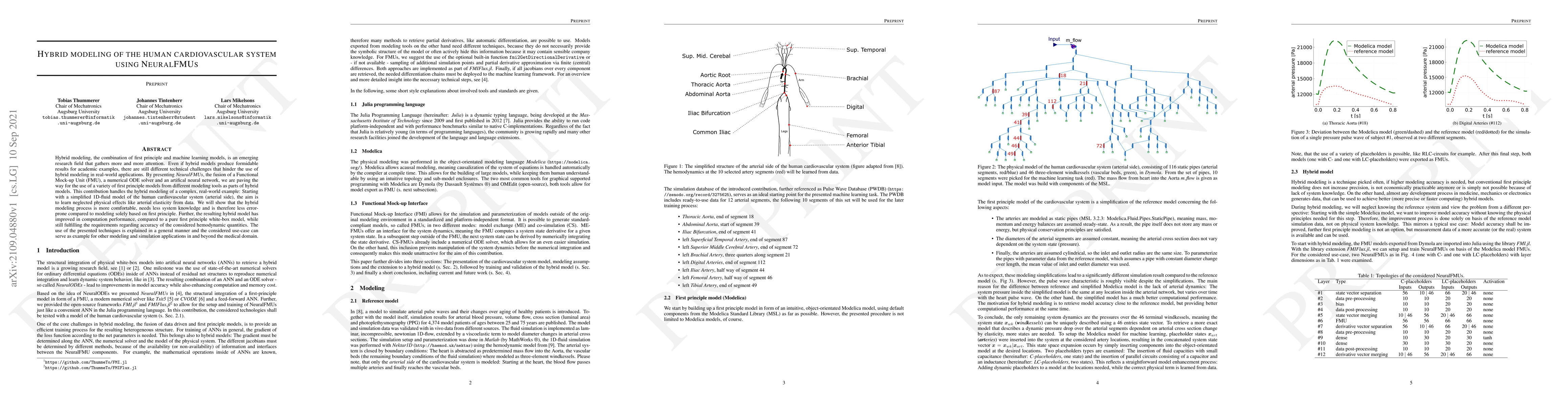 Hybrid modeling, the combination of first principle and machine learning models, is an emerging research field that gathers more and more attention. Even if hybrid models produce formidable results for academic examples, there are still different technical challenges that hinder the use of hybrid modeling in real-world applications. By presenting NeuralFMUs, the fusion of a FMU, a numerical ODE solver and an ANN, we are paving the way for the use of a variety of first principle models from different modeling tools as parts of hybrid models. This contribution handles the hybrid modeling of a complex, real-world example: Starting with a simplified 1D-fluid model of the human cardiovascular system (arterial side), the aim is to learn neglected physical effects like arterial elasticity from data. We will show that the hybrid modeling process is more comfortable, needs less system knowledge and is therefore less error-prone compared to modeling solely based on first principle. Further, the resulting hybrid model has improved in computation performance, compared to a pure first principle white-box model, while still fulfilling the requirements regarding accuracy of the considered hemodynamic quantities. The use of the presented techniques is explained in a general manner and the considered use-case can serve as example for other modeling and simulation applications in and beyond the medical domain.