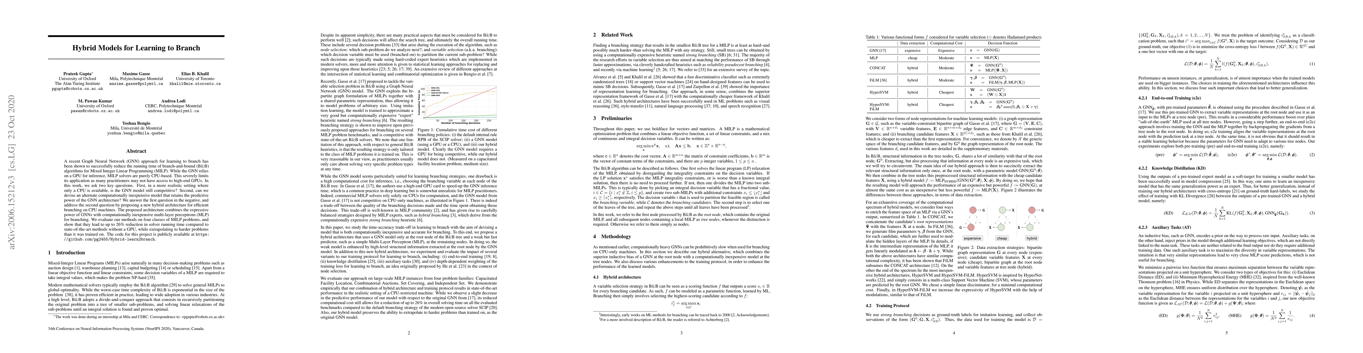 A recent Graph Neural Network (GNN) approach for learning to branch has been shown to successfully reduce the running time of branch-and-bound algorithms for Mixed Integer Linear Programming (MILP). While the GNN relies on a GPU for inference, MILP solvers are purely CPU-based. This severely limits its application as many practitioners may not have access to high-end GPUs. In this work, we ask two key questions. First, in a more realistic setting where only a CPU is available, is the GNN model still competitive? Second, can we devise an alternate computationally inexpensive model that retains the predictive power of the GNN architecture? We answer the first question in the negative, and address the second question by proposing a new hybrid architecture for efficient branching on CPU machines. The proposed architecture combines the expressive power of GNNs with computationally inexpensive multi-layer perceptrons (MLP) for branching. We evaluate our methods on four classes of MILP problems, and show that they lead to up to 26% reduction in solver running time compared to state-of-the-art methods without a GPU, while extrapolating to harder problems than it was trained on. The code for this project is publicly available at https://github.com/pg2455/Hybrid-learn2branch.