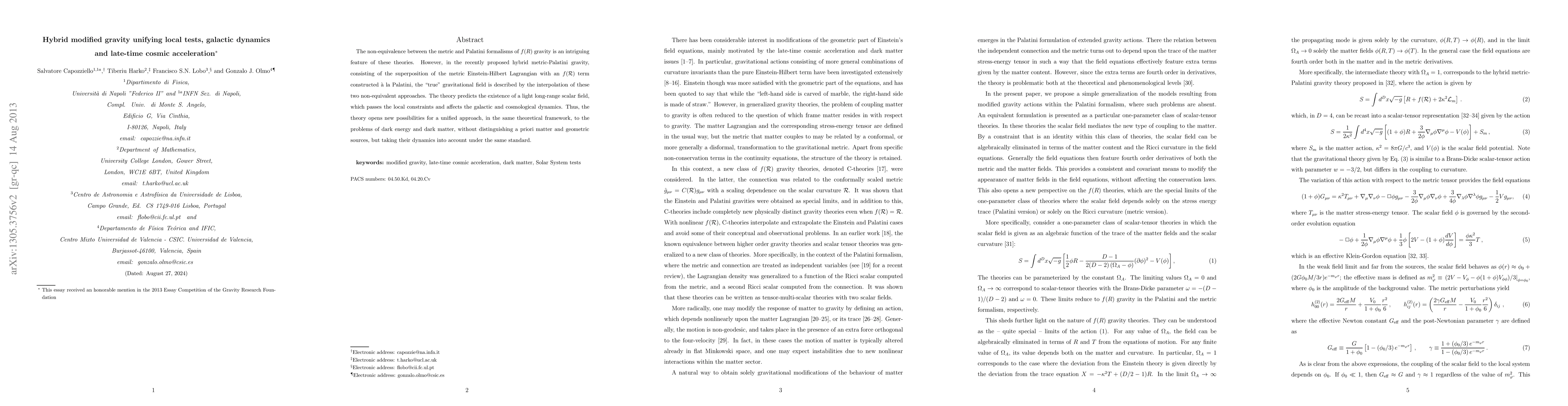 This paper proposes hybrid metric-Palatini gravity, a modified gravity theory that unifies local tests, galactic dynamics, and late-time cosmic acceleration by introducing a light scalar field. The theory combines metric and Palatini formalisms to address dark energy and dark matter within a single framework.