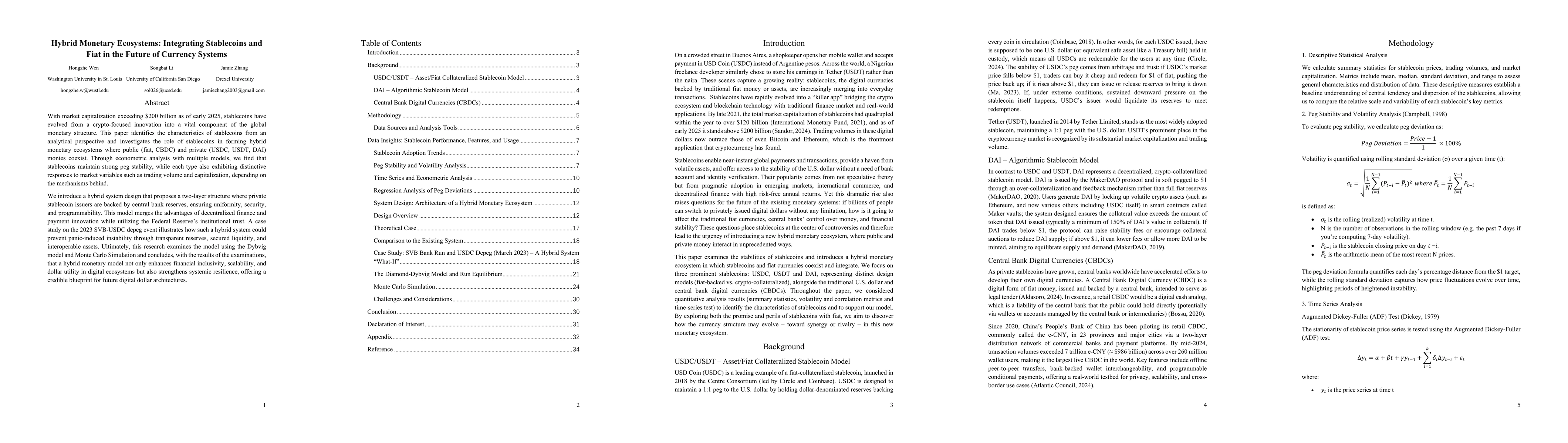 The research identifies stablecoins' key characteristics and their role in hybrid monetary ecosystems with fiat currencies. Econometric analysis reveals stablecoins' peg stability and varying responses to market variables. A proposed two-layer hybrid system, backed by central bank reserves, ensures uniformity, security, and programmability, enhancing financial inclusivity, scalability, and resilience in digital currency systems.