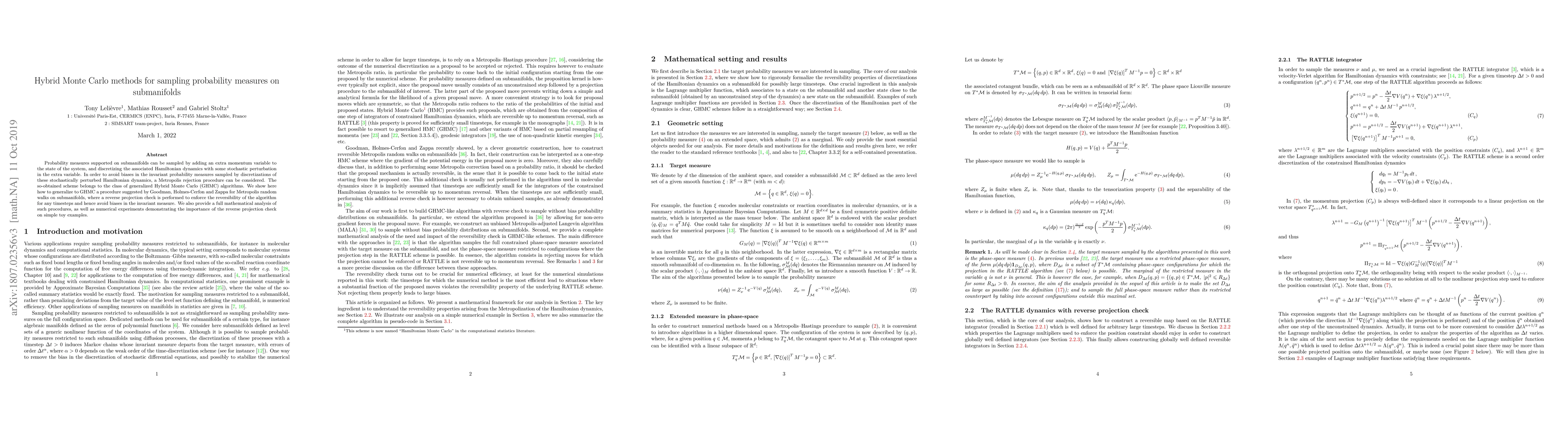 Researchers developed a new method for sampling probability measures on submanifolds using Hybrid Monte Carlo methods, ensuring unbiased results through reverse projection checks.