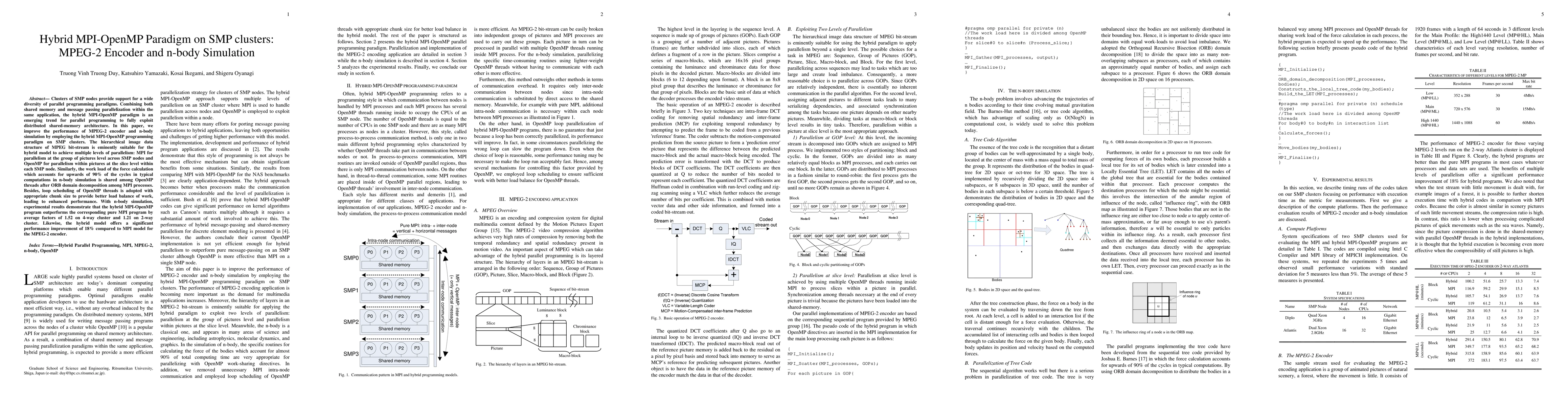 The paper presents an approach to exploit multiple levels of parallelism using a hybrid MPI-OpenMP paradigm, improving performance in MPEG-2 encoding and n-body simulations through effective load balancing and synchronization.