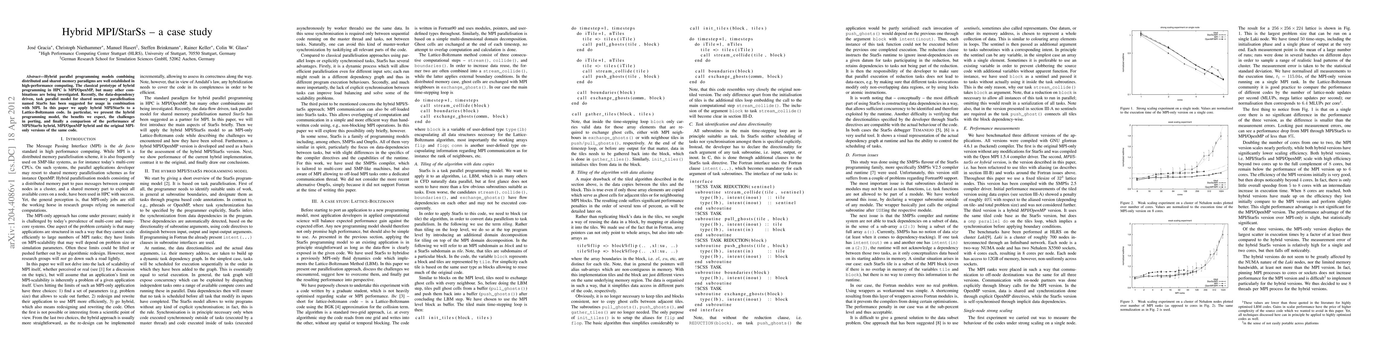 This paper explores hybrid MPI/StarSs programming for a Lattice-Boltzmann code, comparing its performance to MPI/OpenMP and MPI-only versions. The study highlights the benefits and challenges of combining distributed and shared memory paradigms in high-performance computing.