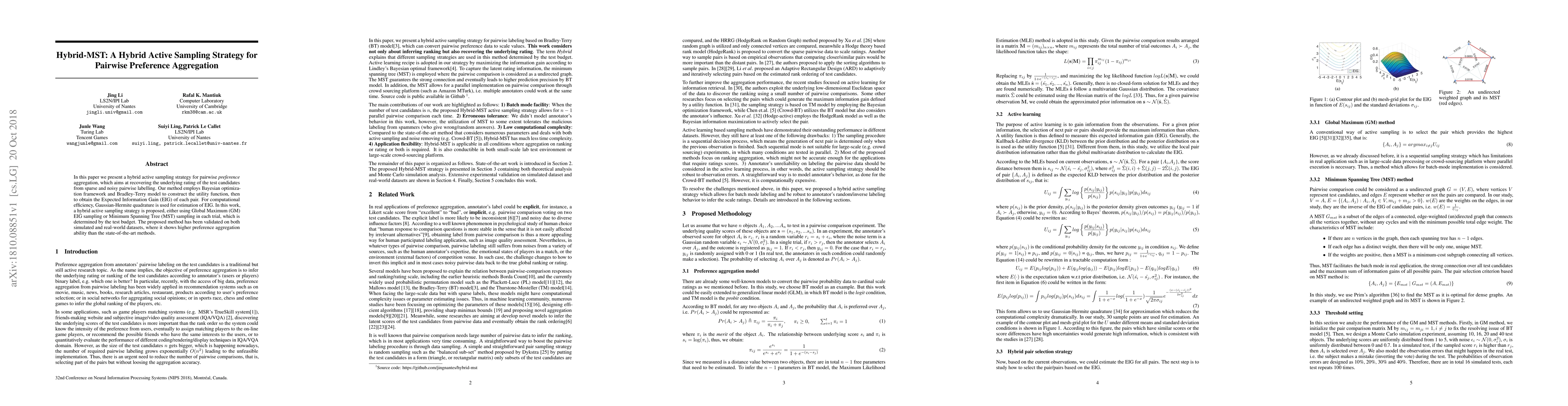 This paper introduces Hybrid-MST, a hybrid active sampling strategy for aggregating pairwise preferences, combining Bayesian optimization and the Bradley-Terry model to estimate utility functions. The method uses Gaussian-Hermite quadrature for computational efficiency and alternates between Global Maximum and Minimum Spanning Tree sampling based on budget constraints, demonstrating superior performance on both simulated and real datasets.