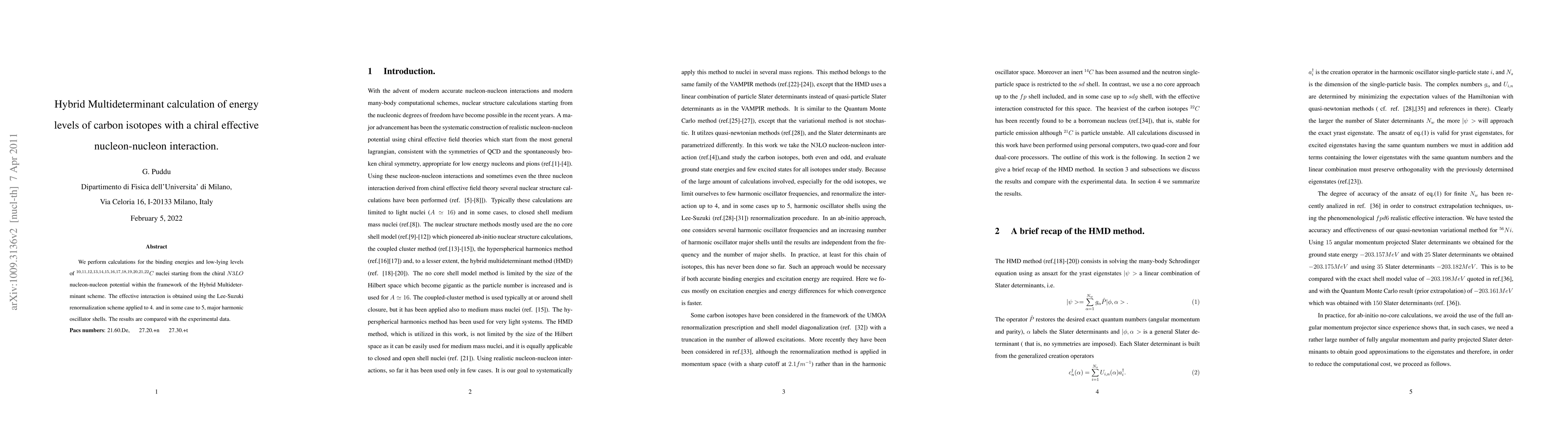 This paper calculates the binding energies and low-lying energy levels of carbon isotopes using a chiral effective nucleon-nucleon interaction and the Hybrid Multideterminant scheme, comparing results with experimental data. The study focuses on 13 carbon isotopes within the first four harmonic oscillator shells.