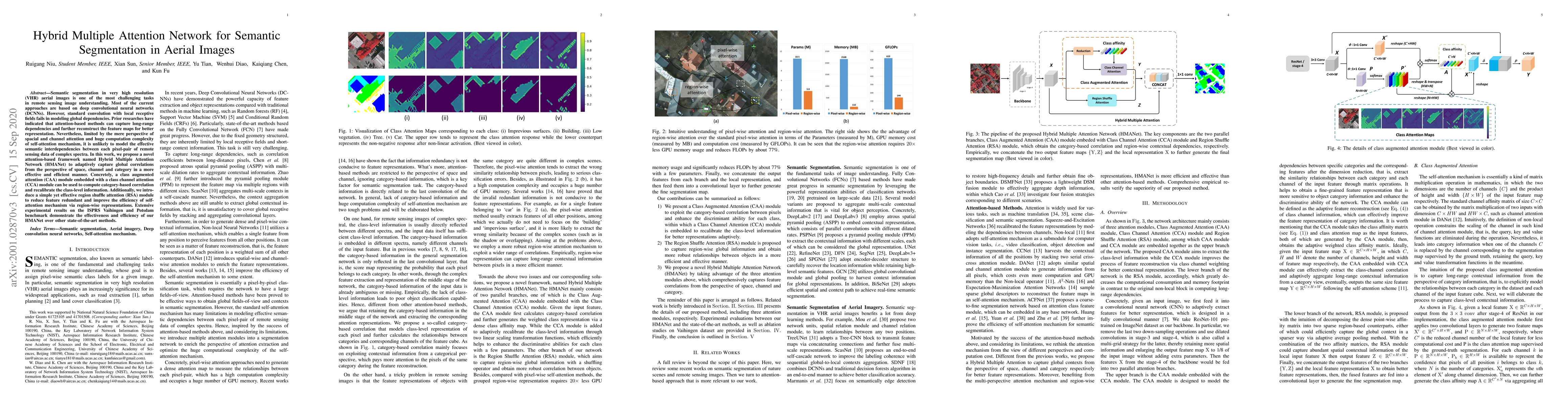 Semantic segmentation in very high resolution (VHR) aerial images is one of the most challenging tasks in remote sensing image understanding. Most of the current approaches are based on deep convolutional neural networks (DCNNs). However, standard convolution with local receptive fields fails in modeling global dependencies. Prior researches have indicated that attention-based methods can capture long-range dependencies and further reconstruct the feature maps for better representation. Nevertheless, limited by the mere perspective of spacial and channel attention and huge computation complexity of self-attention mechanism, it is unlikely to model the effective semantic interdependencies between each pixel-pair of remote sensing data of complex spectra. In this work, we propose a novel attention-based framework named Hybrid Multiple Attention Network (HMANet) to adaptively capture global correlations from the perspective of space, channel and category in a more effective and efficient manner. Concretely, a class augmented attention (CAA) module embedded with a class channel attention (CCA) module can be used to compute category-based correlation and recalibrate the class-level information. Additionally, we introduce a simple yet effective region shuffle attention (RSA) module to reduce feature redundant and improve the efficiency of self-attention mechanism via region-wise representations. Extensive experimental results on the ISPRS Vaihingen and Potsdam benchmark demonstrate the effectiveness and efficiency of our HMANet over other state-of-the-art methods.