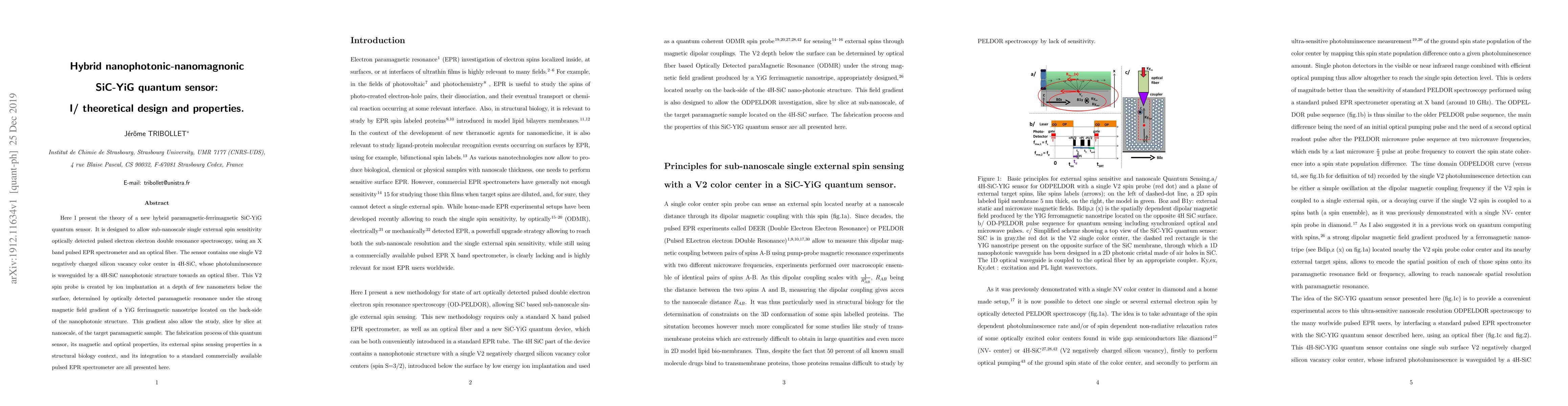 Here I present the theory of a new hybrid paramagnetic-ferrimagnetic SiC-YiG quantum sensor. It is designed to allow sub-nanoscale single external spin sensitivity optically detected pulsed electron electron double resonance spectroscopy, using an X band pulsed EPR spectrometer and an optical fiber. The sensor contains one single V2 negatively charged silicon vacancy color center in 4H-SiC, whose photoluminescence is waveguided by a 4H-SiC nanophotonic structure towards an optical fiber. This V2 spin probe is created by ion implantation at a depth of few nanometers below the surface, determined by optically detected paramagnetic resonance under the strong magnetic field gradient of a YiG ferrimagnetic nanostripe located on the back-side of the nanophotonic structure. This gradient also allow the study, slice by slice at nanoscale, of the target paramagnetic sample. The fabrication process of this quantum sensor, its magnetic and optical properties, its external spins sensing properties in a structural biology context, and its integration to a standard commercially available pulsed EPR spectrometer are all presented here.