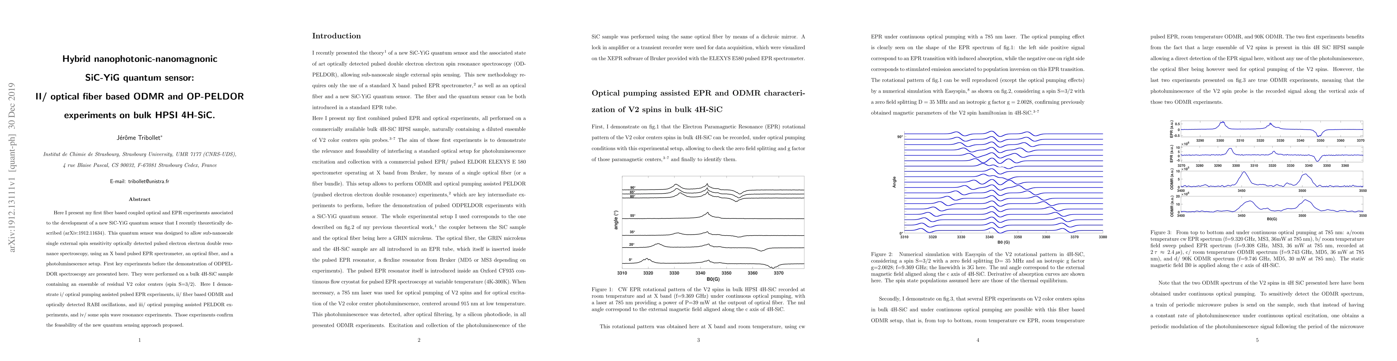 Here I present my first fiber based coupled optical and EPR experiments associated to the development of a new SiC-YiG quantum sensor that I recently theoretically described (arXiv:1912.11634). This quantum sensor was designed to allow sub-nanoscale single external spin sensitivity optically detected pulsed electron electron double resonance spectroscopy, using an X band pulsed EPR spectrometer, an optical fiber, and a photoluminescence setup. First key experiments before the demonstration of ODPELDOR spectroscopy are presented here. They were performed on a bulk 4H-SiC sample containing an ensemble of residual V2 color centers (spin S=3/2). Here I demonstrate i/ optical pumping assisted pulsed EPR experiments, ii/ fiber based ODMR and optically detected RABI oscillations, and iii/ optical pumping assisted PELDOR experiments, and iv/ some spin wave resonance experiments. Those experiments confirm the feasability of the new quantum sensing approach proposed.