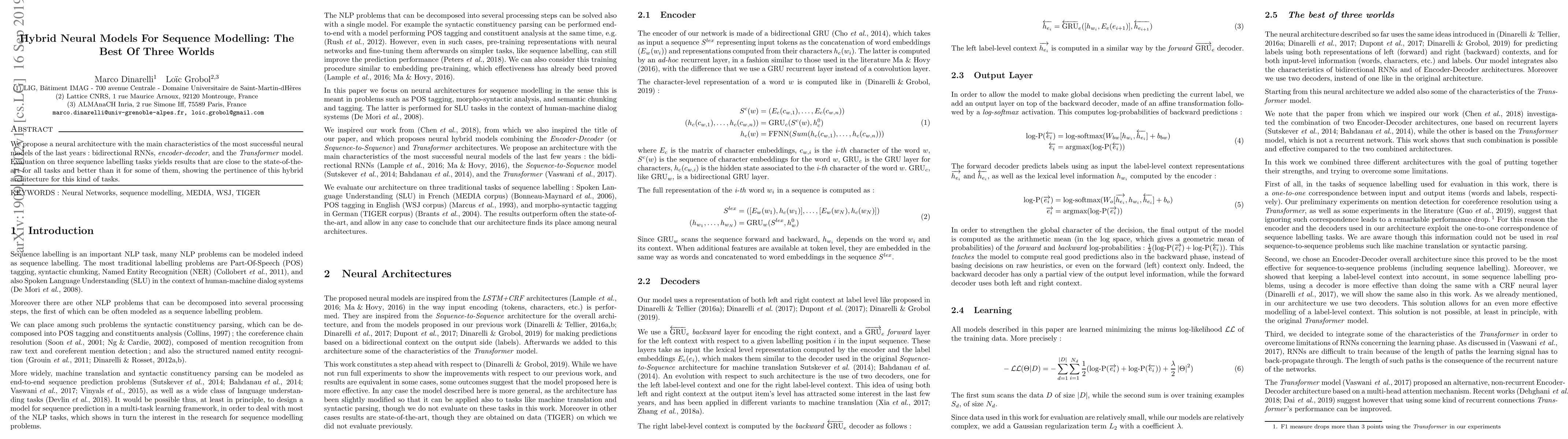 The paper introduces a hybrid neural model combining elements of bidirectional RNNs, encoder-decoder, and Transformer architectures. This model outperforms or matches state-of-the-art results on sequence labelling tasks, demonstrating its effectiveness.