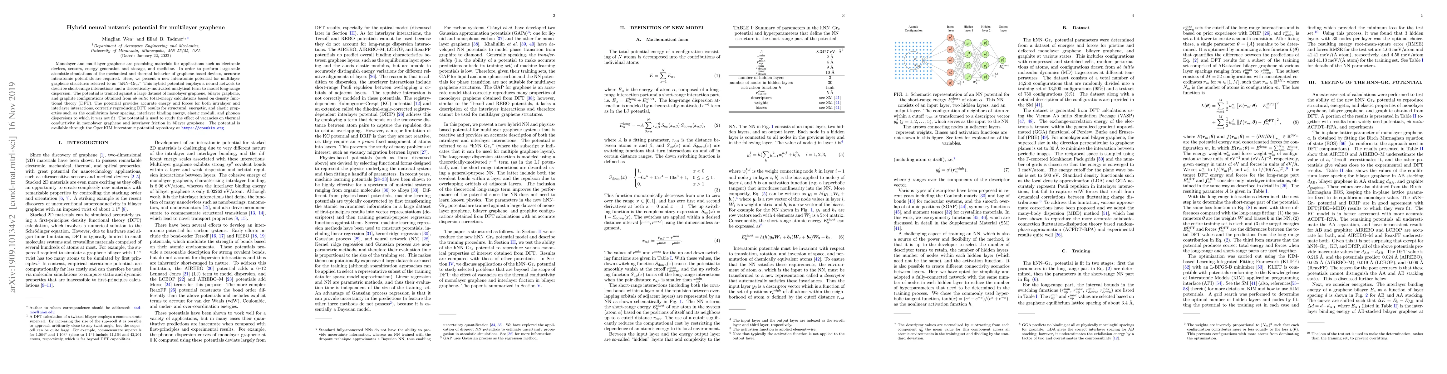 This research introduces a new hybrid neural network potential, "hNN--Gr$_x$", for multilayer graphene that accurately models both short-range and long-range interactions. The potential, trained on DFT data, reproduces DFT results for structural and elastic properties and is used to study thermal conductivity and interlayer friction.