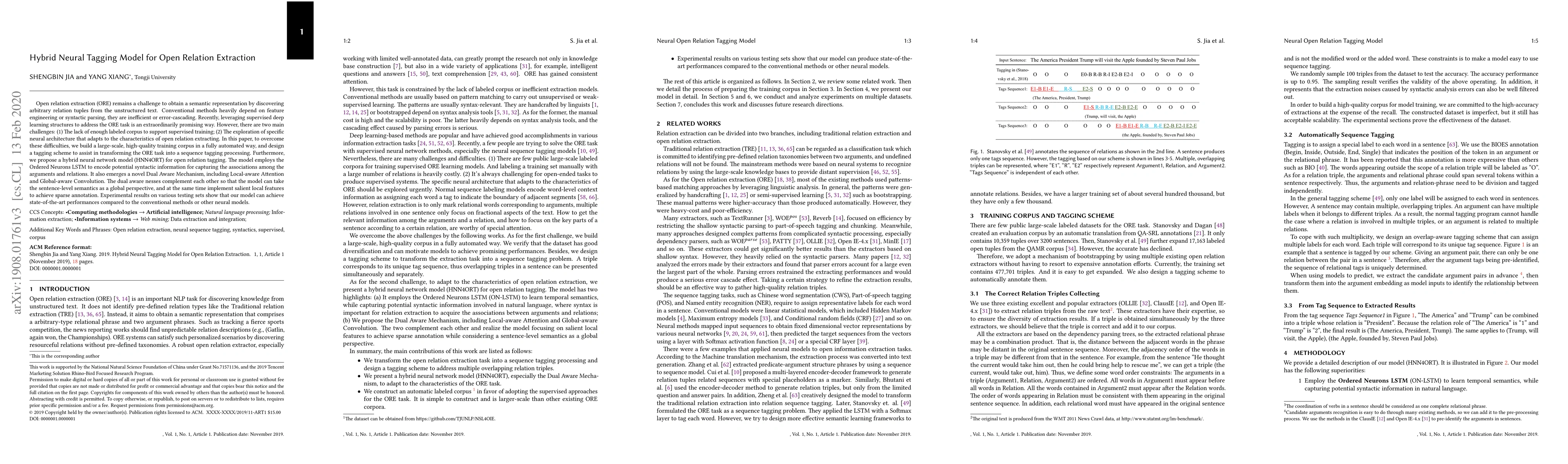 This paper proposes a hybrid neural tagging model (HNN4ORT) for open relation extraction, leveraging a large-scale automated training corpus and a sequence tagging approach. The model combines Ordered Neurons LSTM and a novel Dual Aware Mechanism for capturing both global and local features, achieving state-of-the-art performance in relation extraction tasks.