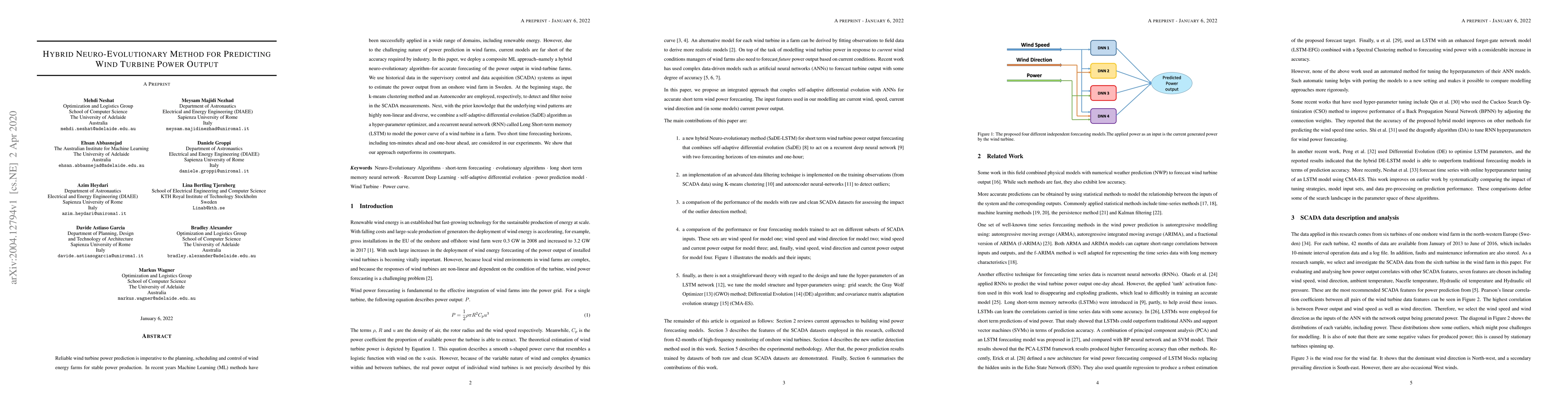 This paper proposes a hybrid neuro-evolutionary method combining k-means clustering, Autoencoders, self-adaptive differential evolution, and LSTM networks for accurate wind turbine power prediction. The method outperforms existing models in forecasting power output for an onshore wind farm in Sweden.