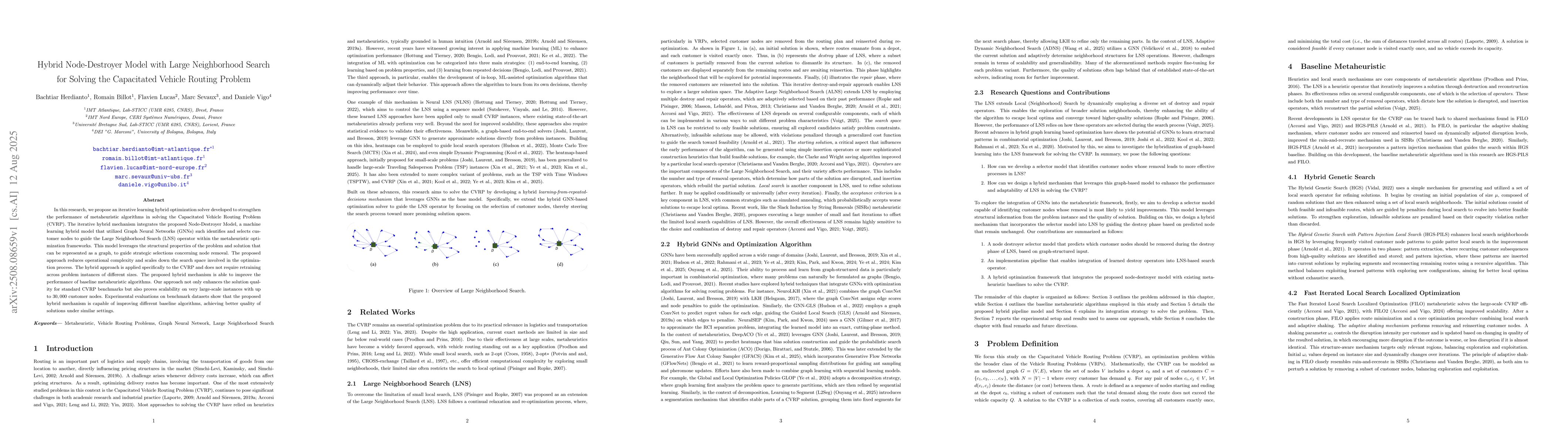 In this research, we propose an iterative learning hybrid optimization solver developed to strengthen the performance of metaheuristic algorithms in solving the Capacitated Vehicle Routing Problem (CVRP). The iterative hybrid mechanism integrates the proposed Node-Destroyer Model, a machine learning hybrid model that utilized Graph Neural Networks (GNNs) such identifies and selects customer nodes to guide the Large Neighborhood Search (LNS) operator within the metaheuristic optimization frameworks. This model leverages the structural properties of the problem and solution that can be represented as a graph, to guide strategic selections concerning node removal. The proposed approach reduces operational complexity and scales down the search space involved in the optimization process. The hybrid approach is applied specifically to the CVRP and does not require retraining across problem instances of different sizes. The proposed hybrid mechanism is able to improve the performance of baseline metaheuristic algorithms. Our approach not only enhances the solution quality for standard CVRP benchmarks but also proves scalability on very large-scale instances with up to 30,000 customer nodes. Experimental evaluations on benchmark datasets show that the proposed hybrid mechanism is capable of improving different baseline algorithms, achieving better quality of solutions under similar settings.