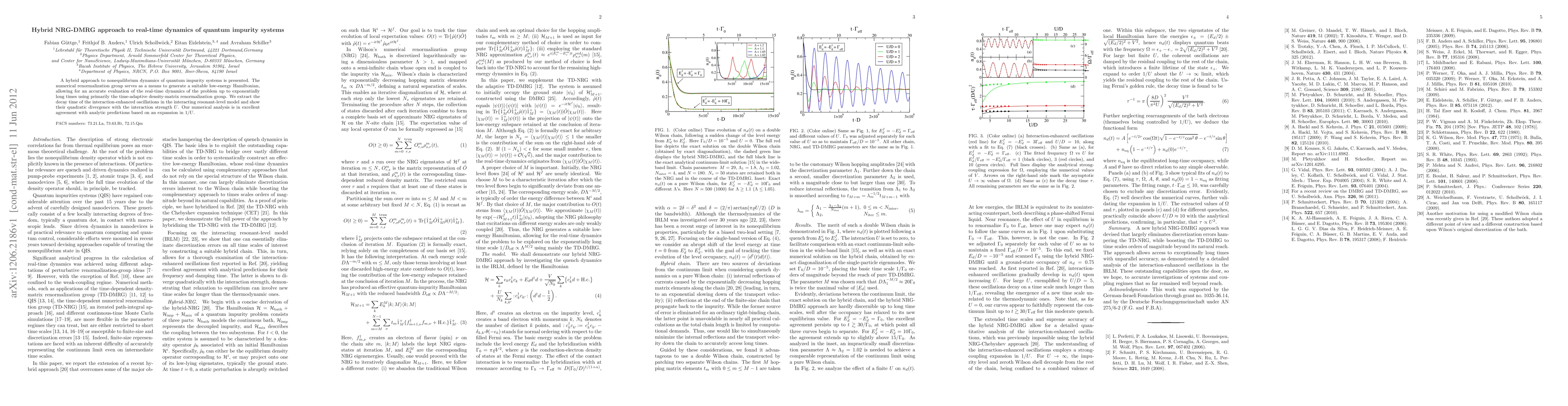 This paper introduces a hybrid NRG-DMRG method for studying nonequilibrium dynamics in quantum impurity systems, achieving accurate real-time evaluations over long timescales. The study reveals quadratic divergence in the decay time of oscillations in the interacting resonant-level model, aligning well with analytic predictions.