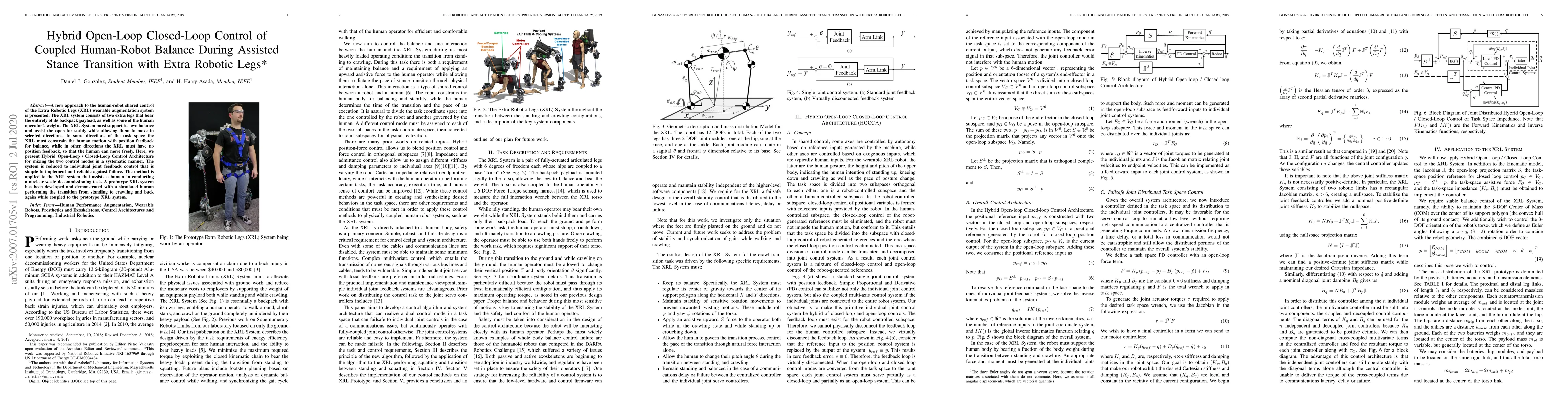 A new approach to the human-robot shared control of the Extra Robotic Legs (XRL) wearable augmentation system is presented. The XRL system consists of two extra legs that bear the entirety of its backpack payload, as well as some of the human operator's weight. The XRL System must support its own balance and assist the operator stably while allowing them to move in selected directions. In some directions of the task space the XRL must constrain the human motion with position feedback for balance, while in other directions the XRL must have no position feedback, so that the human can move freely. Here, we present Hybrid Open-Loop / Closed-Loop Control Architecture for mixing the two control modes in a systematic manner. The system is reduced to individual joint feedback control that is simple to implement and reliable against failure. The method is applied to the XRL system that assists a human in conducting a nuclear waste decommissioning task. A prototype XRL system has been developed and demonstrated with a simulated human performing the transition from standing to crawling and back again while coupled to the prototype XRL system.