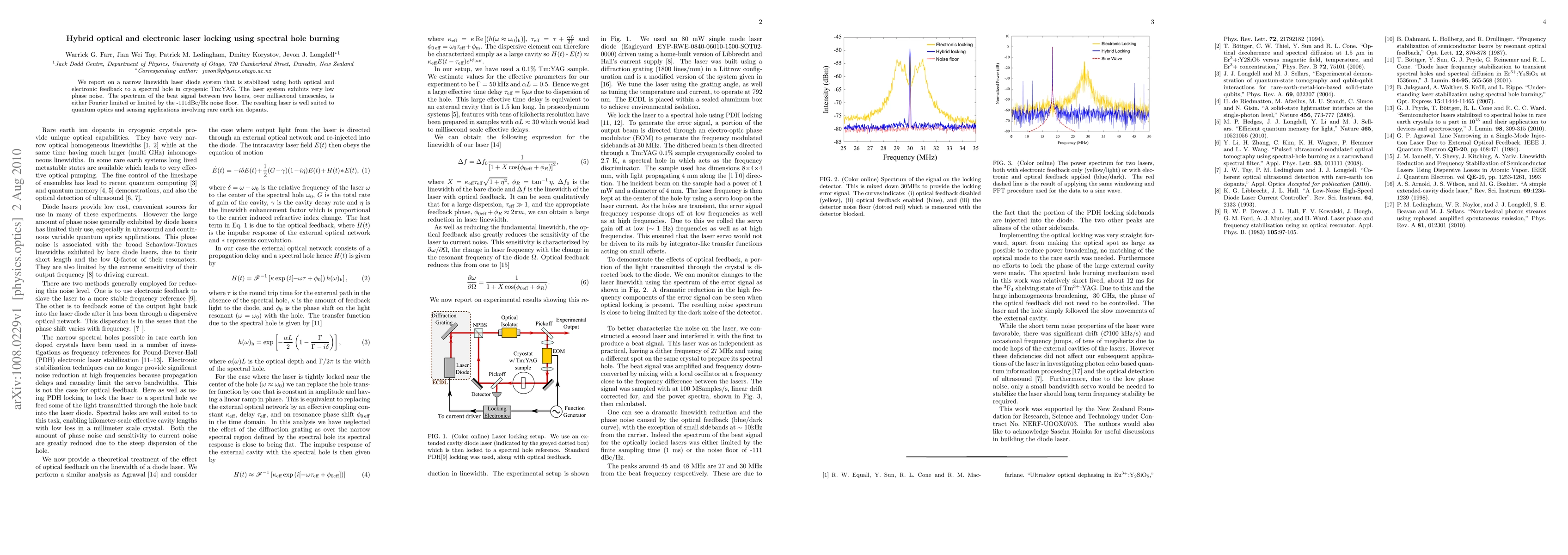 This paper describes a laser diode system stabilized through both optical and electronic feedback to a spectral hole in cryogenic Tm:YAG, achieving very low phase noise and a narrow linewidth, making it ideal for quantum optics and sensing applications. The beat signal spectrum exhibits either Fourier-limited performance or a noise floor of -111dBc/Hz over milliseconds.