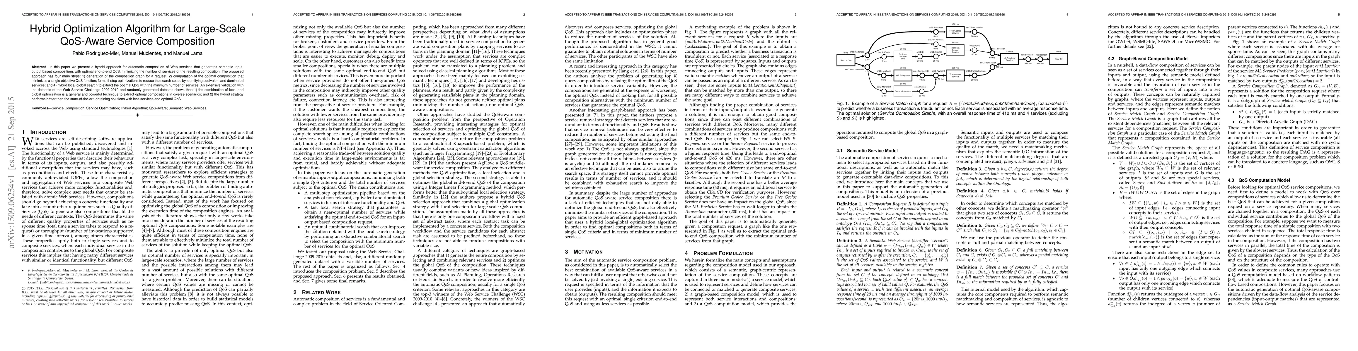 In this paper we present a hybrid approach for automatic composition of Web services that generates semantic input-output based compositions with optimal end-to-end QoS, minimizing the number of services of the resulting composition. The proposed approach has four main steps: 1) generation of the composition graph for a request; 2) computation of the optimal composition that minimizes a single objective QoS function; 3) multi-step optimizations to reduce the search space by identifying equivalent and dominated services; and 4) hybrid local-global search to extract the optimal QoS with the minimum number of services. An extensive validation with the datasets of the Web Service Challenge 2009-2010 and randomly generated datasets shows that: 1) the combination of local and global optimization is a general and powerful technique to extract optimal compositions in diverse scenarios; and 2) the hybrid strategy performs better than the state-of-the-art, obtaining solutions with less services and optimal QoS.