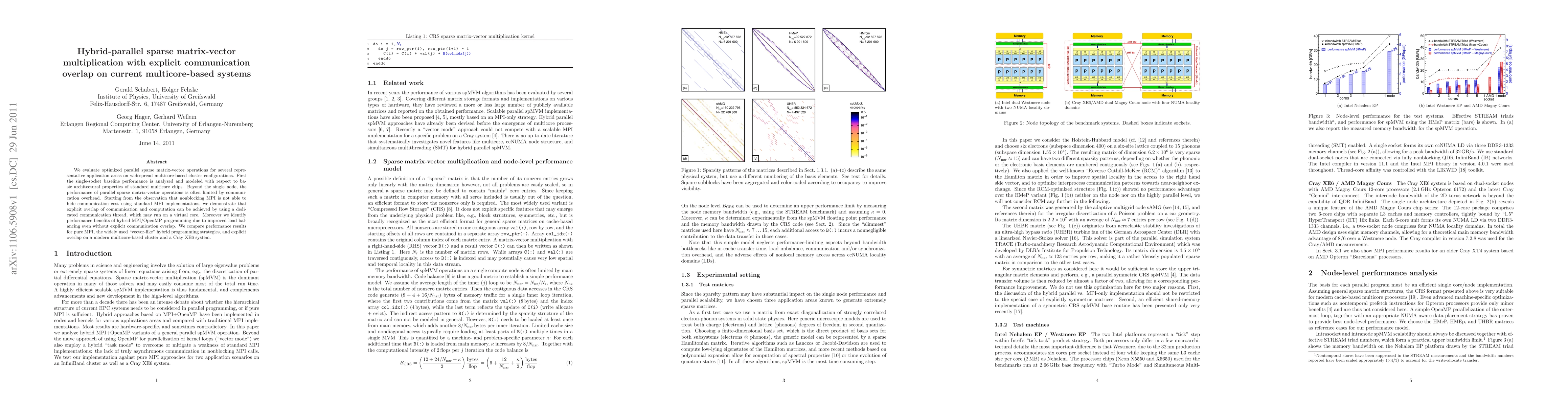This paper evaluates optimized parallel sparse matrix-vector multiplication techniques, focusing on hybrid-parallel approaches that overlap communication and computation to mitigate communication overhead on multicore systems. It compares performance of pure MPI, hybrid MPI/OpenMP, and explicit overlap strategies on modern clusters and Cray XE6 systems.