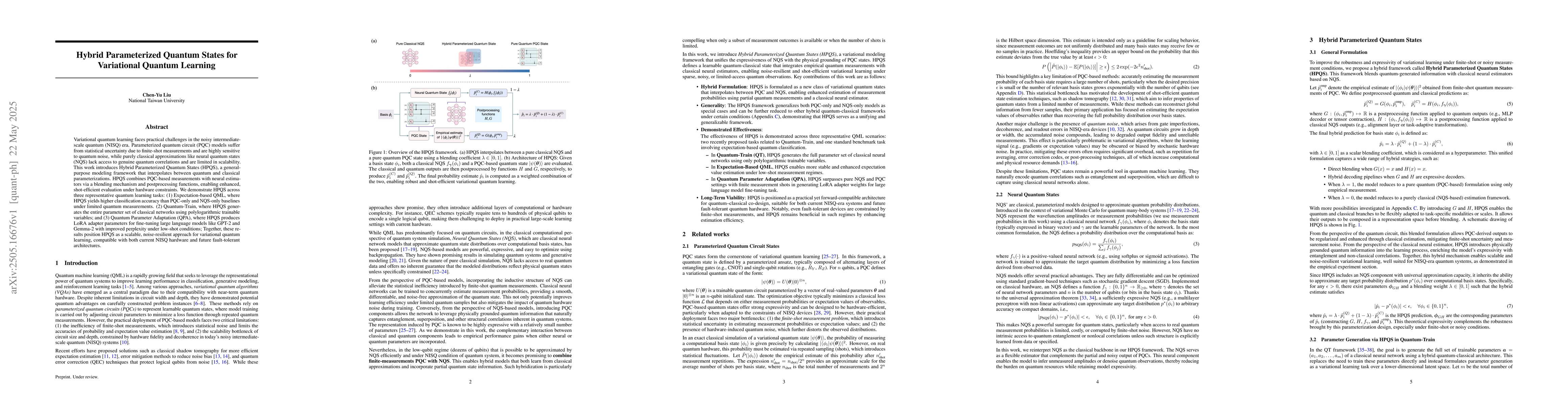 Variational quantum learning faces practical challenges in the noisy intermediate-scale quantum (NISQ) era. Parameterized quantum circuit (PQC) models suffer from statistical uncertainty due to finite-shot measurements and are highly sensitive to quantum noise, while purely classical approximations like neural quantum states (NQS) lack access to genuine quantum correlations and are limited in scalability. This work introduces Hybrid Parameterized Quantum States (HPQS), a general-purpose modeling framework that interpolates between quantum and classical parameterizations. HPQS combines PQC-based measurements with neural estimators via a blending mechanism and postprocessing functions, enabling enhanced, shot-efficient evaluation under hardware constraints. We demonstrate HPQS across three representative quantum learning tasks: (1) Expectation-based QML, where HPQS yields higher classification accuracy than PQC-only and NQS-only baselines under limited quantum measurements. (2) Quantum-Train, where HPQS generates the entire parameter set of classical networks using polylogarithmic trainable variables; and (3) Quantum Parameter Adaptation (QPA), where HPQS produces LoRA adapter parameters for fine-tuning large language models like GPT-2 and Gemma-2 with improved perplexity under low-shot conditions; Together, these results position HPQS as a scalable, noise-resilient approach for variational quantum learning, compatible with both current NISQ hardware and future fault-tolerant architectures.