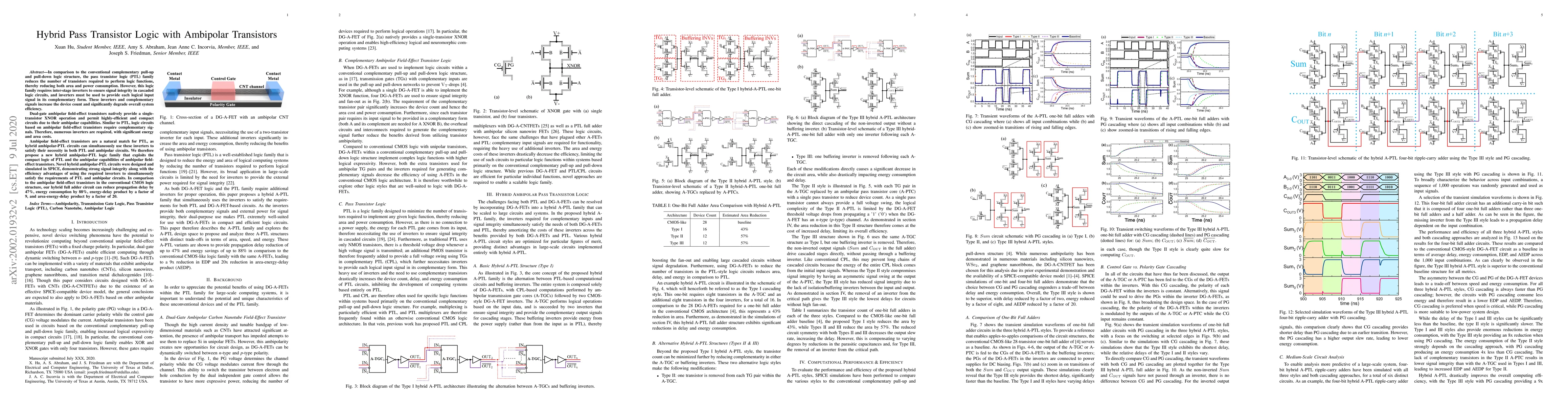 This paper proposes a hybrid pass transistor logic (PTL) with ambipolar transistors to reduce the number of transistors and improve efficiency compared to conventional CMOS. The design leverages ambipolar transistors' single-transistor XNOR operation to minimize inverter use, achieving a 47% reduction in propagation delay and an 88% reduction in energy consumption.