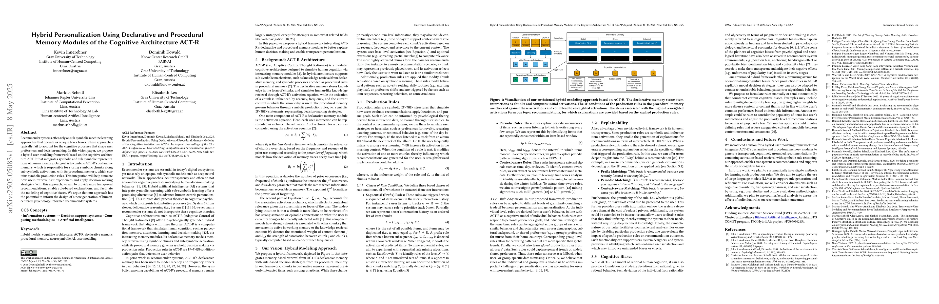 Recommender systems often rely on sub-symbolic machine learning approaches that operate as opaque black boxes. These approaches typically fail to account for the cognitive processes that shape user preferences and decision-making. In this vision paper, we propose a hybrid user modeling framework based on the cognitive architecture ACT-R that integrates symbolic and sub-symbolic representations of human memory. Our goal is to combine ACT-R's declarative memory, which is responsible for storing symbolic chunks along sub-symbolic activations, with its procedural memory, which contains symbolic production rules. This integration will help simulate how users retrieve past experiences and apply decision-making strategies. With this approach, we aim to provide more transparent recommendations, enable rule-based explanations, and facilitate the modeling of cognitive biases. We argue that our approach has the potential to inform the design of a new generation of human-centered, psychology-informed recommender systems.
