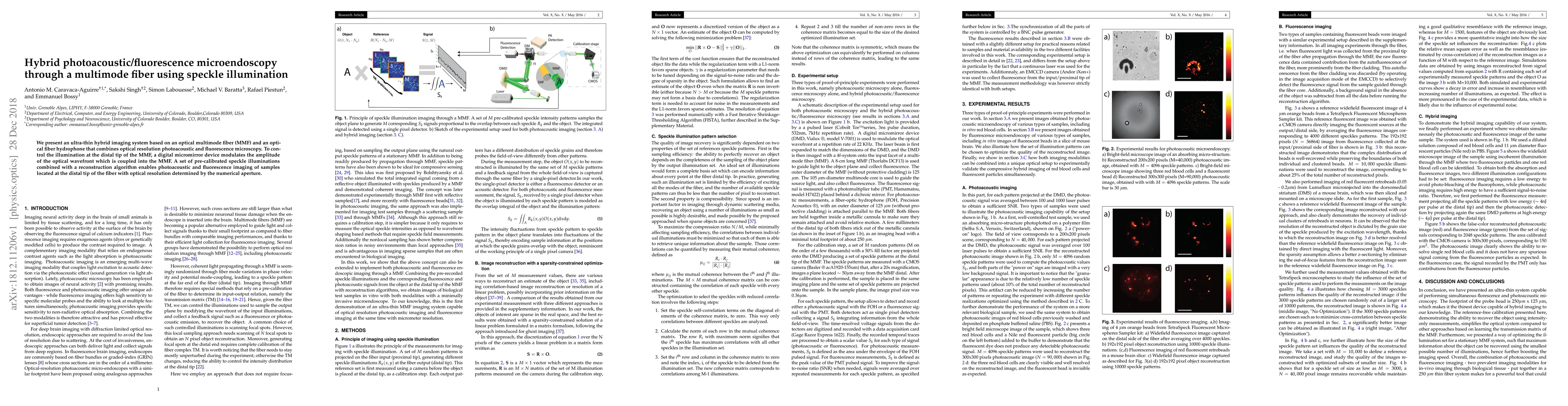 This research introduces an ultra-thin hybrid imaging system combining photoacoustic and fluorescence microscopy through an optical multimode fiber, utilizing a digital micromirror device for speckle illumination modulation and reconstruction for high-resolution imaging. The system employs an optical fiber hydrophone for photoacoustic imaging and achieves optical resolution determined by the fiber's numerical aperture.