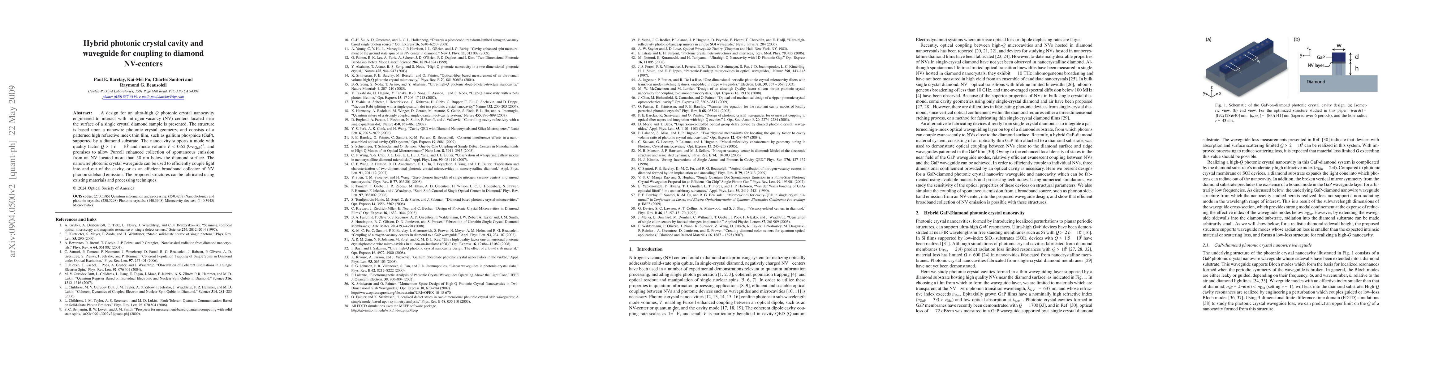 This paper presents a design for an ultra-high Q photonic crystal nanocavity engineered to interact with NV centers in diamond, featuring a nanowire geometry with a GaP membrane supported by a diamond substrate. The cavity promises Purcell-enhanced emission collection from NV centers and an efficient waveguide for light coupling.