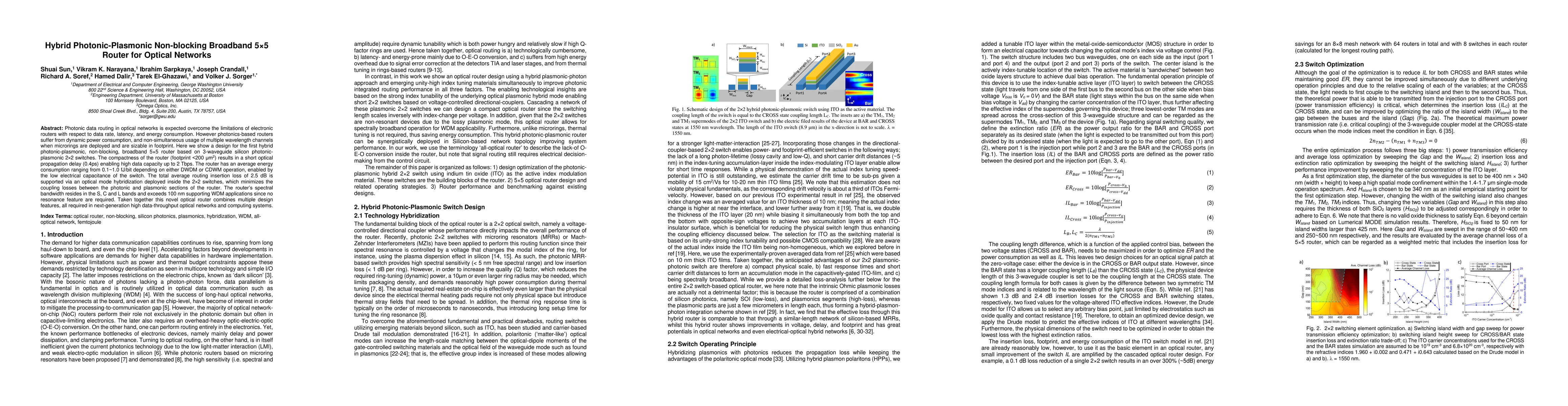 This paper presents a hybrid photonic-plasmonic, non-blocking, broadband 5x5 router designed for optical networks, achieving a compact footprint of <250 μm² while supporting multi-wavelength up to 206 nm in the telecom band, with high operation speed and low energy consumption.
