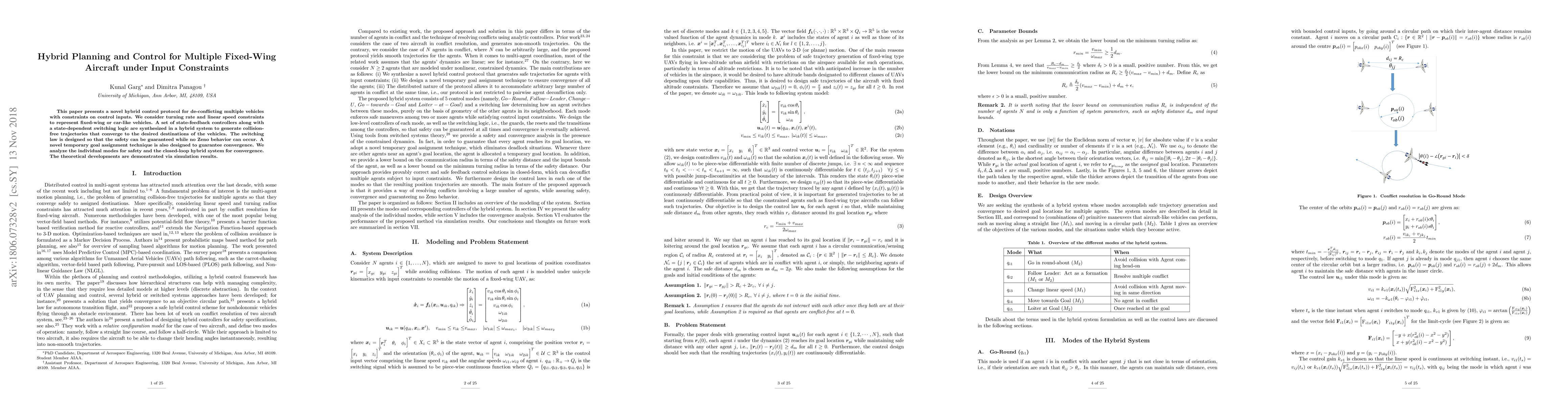 This paper introduces a hybrid control protocol for managing multiple fixed-wing aircraft under input constraints, employing state-feedback controllers and a switching logic to generate collision-free trajectories. The protocol ensures safety and convergence through a temporary goal assignment technique, validated by simulation.