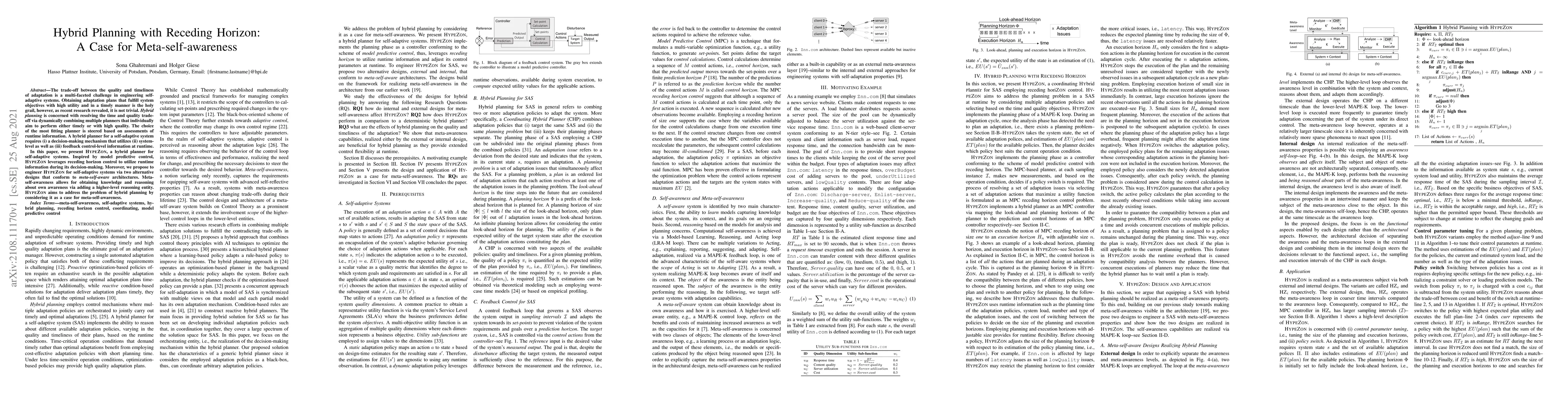 This paper introduces HYPEZON, a hybrid planner for self-adaptive systems that combines multiple planners using receding horizon control to balance adaptation quality and timeliness. It employs meta-self-awareness for enhanced decision-making, leveraging both system-level and feedback control-level information.