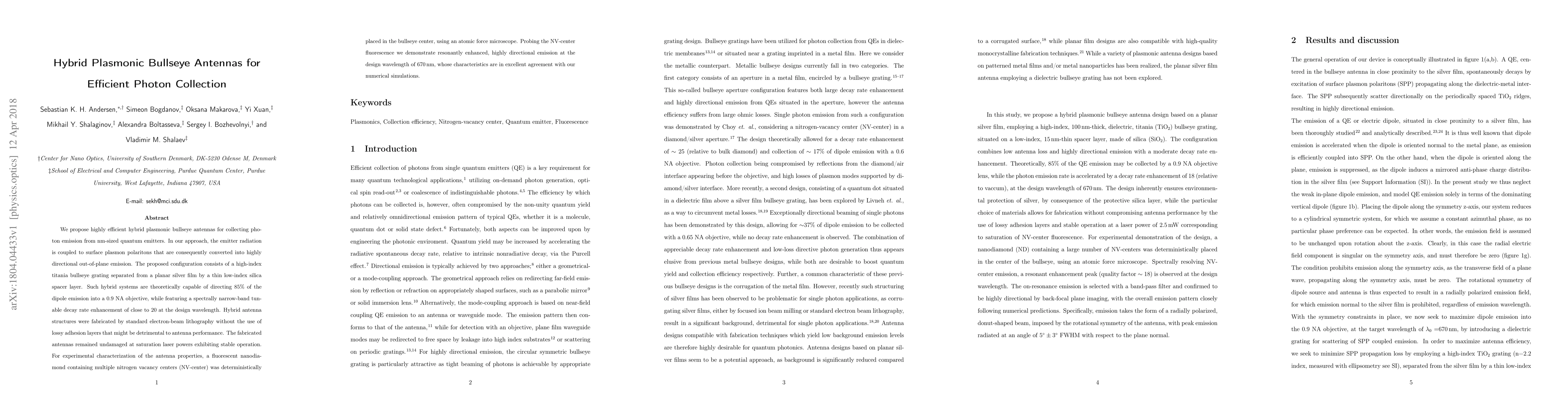 This paper proposes hybrid plasmonic bullseye antennas for efficient photon collection from nm-sized quantum emitters, achieving 85% directional emission into a 0.9 NA objective with a spectrally narrow-band enhancement. Experimental validation using fluorescent nanodiamonds shows agreement with simulations.