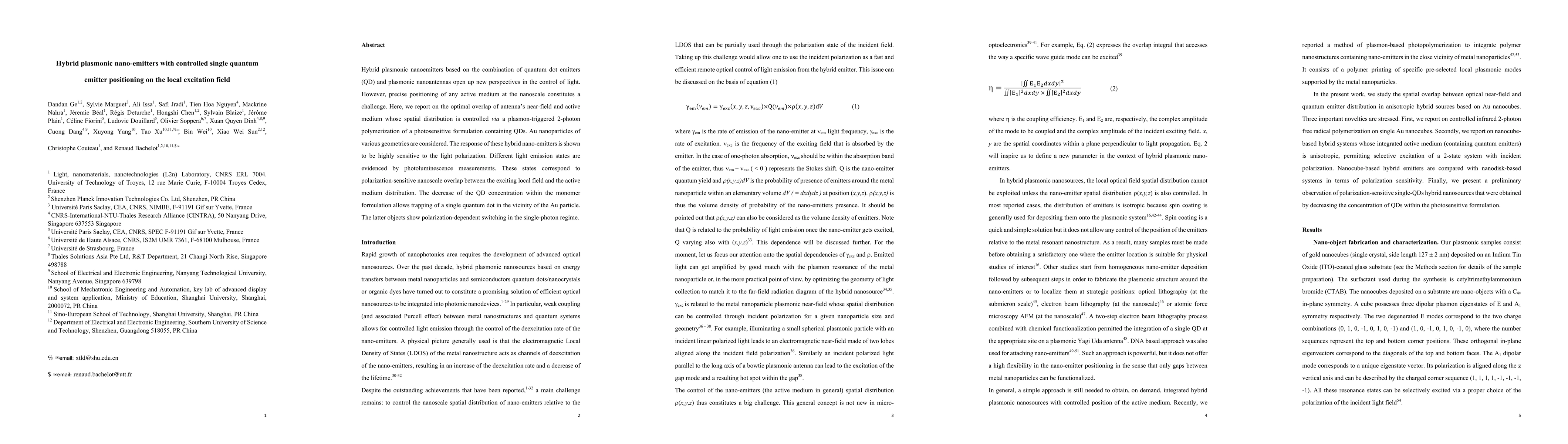 This paper reports on hybrid plasmonic nanoemitters combining quantum dots and plasmonic nanoantennas, enabling precise control over single quantum emitter positioning via plasmon-triggered polymerization. The study shows polarization-dependent switching and single-photon emission states, highlighting the potential for advanced light manipulation at the nanoscale.