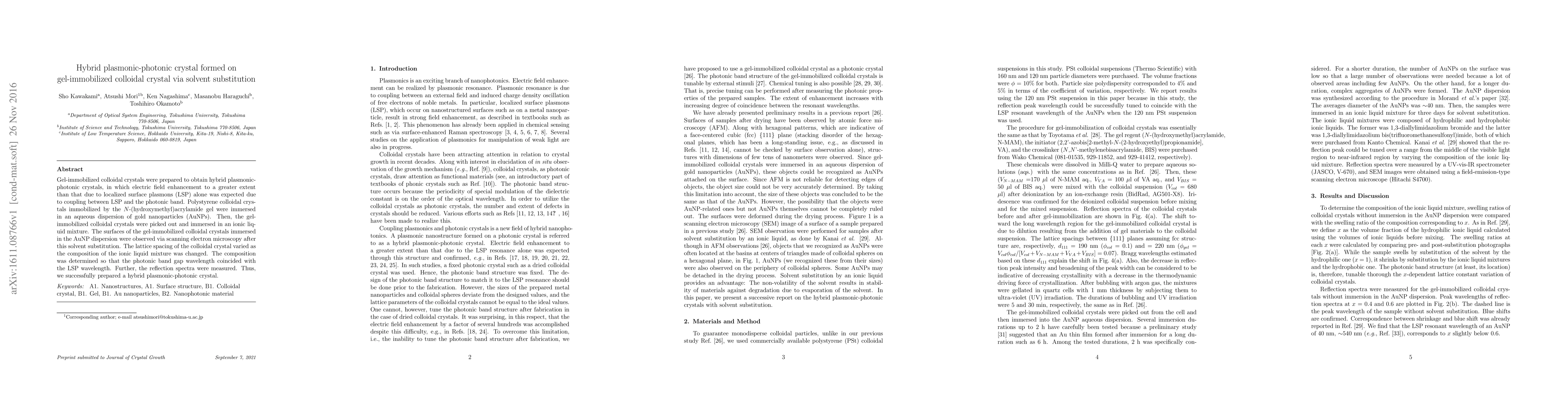 Gel-immobilized colloidal crystals were prepared to obtain hybrid plasmonic-photonic crystals, in which electric field enhancement to a greater extent than that due to localized surface plasmons (LSP) alone was expected due to coupling between LSP and the photonic band. Polystyrene colloidal crystals immobilized by the N-(hydroxymethyl)acrylamide gel were immersed in an aqueous dispersion of gold nanoparticles (AuNPs). Then, the gel-immobilized colloidal crystals were picked out and immersed in an ionic liquid mixture. The surfaces of the gel-immobilized colloidal crystals immersed in the AuNP dispersion were observed via scanning electron microscopy after this solvent substitution. The lattice spacing of the colloidal crystal varied as the composition of the ionic liquid mixture was changed. The composition was determined so that the photonic band gap wavelength coincided with the LSP wavelength. Further, the reflection spectra were measured. Thus, we successfully prepared a hybrid plasmonic-photonic crystal.