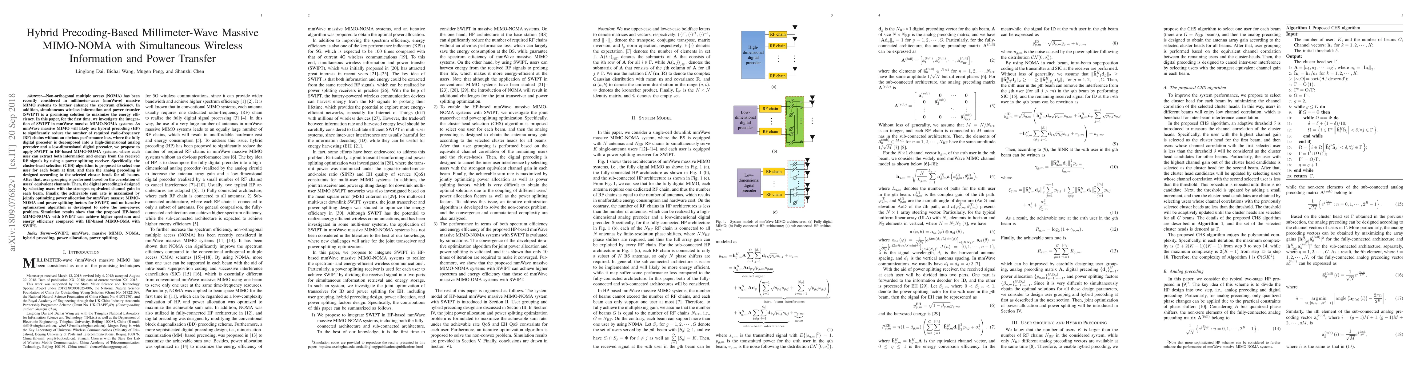 This paper investigates integrating simultaneous wireless information and power transfer (SWIPT) in millimeter-wave (mmWave) massive MIMO-NOMA systems using hybrid precoding. The proposed method maximizes sum rate by optimizing power allocation and power splitting factors, achieving higher spectrum and energy efficiency compared to traditional MIMO-OMA systems.