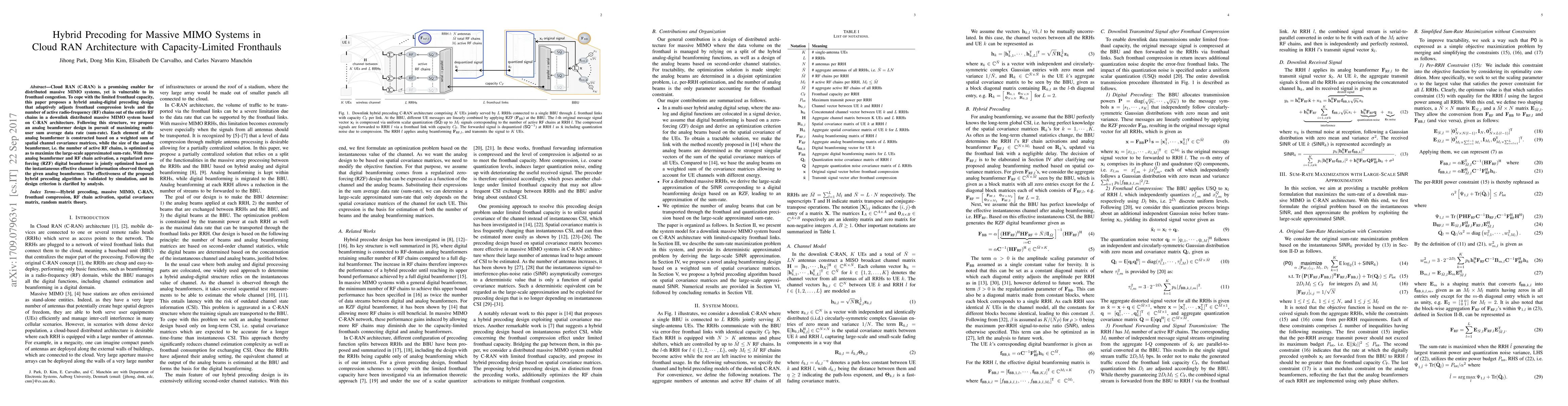 This paper proposes a hybrid analog-digital precoding method for massive MIMO systems in a Cloud RAN architecture to manage fronthaul congestion. The method adaptively adjusts fronthaul compression and active RF chains to maximize multi-user sum-rate, using an analog beamformer and a regularized zero-forcing digital beamformer. The effectiveness is validated through simulations.