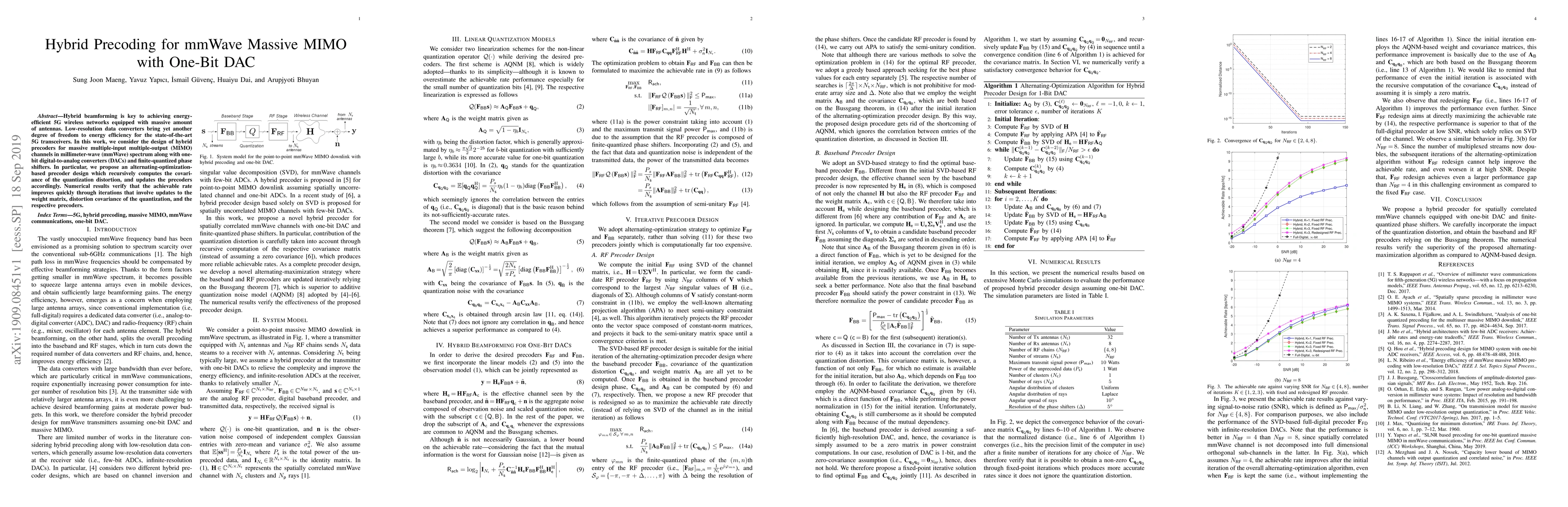This paper proposes an alternating-optimization-based hybrid precoder design for mmWave massive MIMO systems using one-bit DACs. The method recursively computes the covariance of quantization distortion and updates precoders, leading to improved achievable rates through iterative optimization.