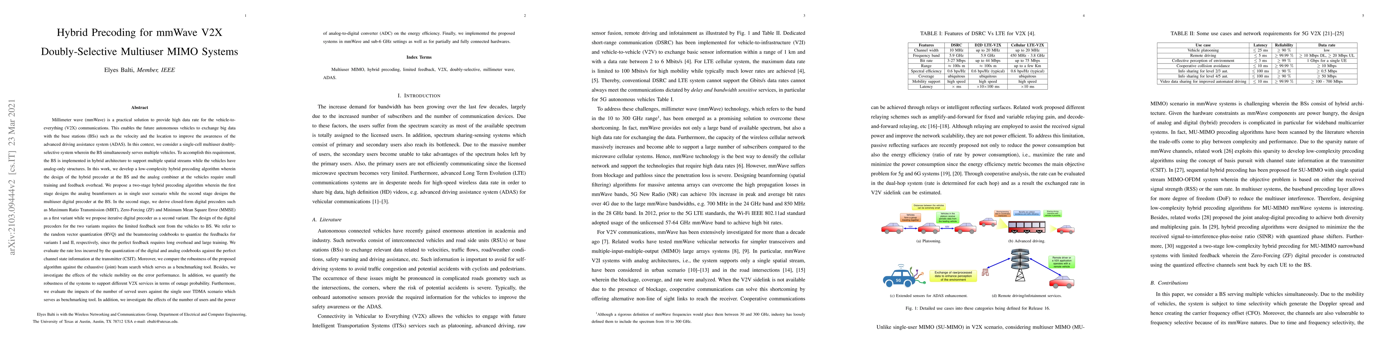 This paper proposes a low-complexity hybrid precoding algorithm for mmWave V2X multiuser MIMO systems, focusing on reducing training and feedback overhead. The algorithm consists of two stages: analog beamformers for vehicles and digital precoders for the base station, with both variants evaluated against perfect channel state information.