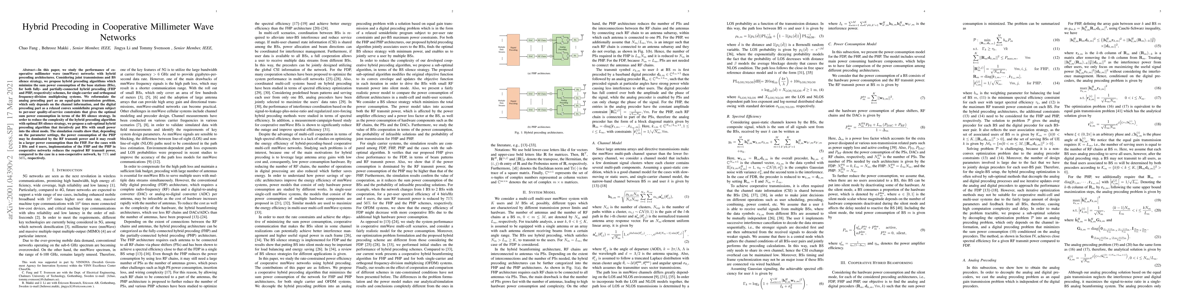 In this paper, we study the performance of cooperative millimeter wave (mmWave) networks with hybrid precoding architectures. Considering joint transmissions and BS silence strategy, we propose hybrid precoding algorithms which minimize the sum power consumption of the base stations (BSs), for both fully- and partially-connected hybrid precoding (FHP and PHP, respectively) schemes, for single-carrier and orthogonal frequency-division multiplexing systems. We reformulate the analog precoding part as an equal-gain transmission problem, which only depends on the channel information, and the digital precoding part as a relaxed convex semidefinite program subject to per-user quality-of-service constraints that gives the optimal sum power consumption in terms of the BS silence strategy. In order to reduce the complexity of the hybrid precoding algorithm with optimal BS silence strategy, we propose a sub-optimal hybrid precoding algorithm that iteratively put BSs with small power into the silent mode. The simulation results show that, depending on the parameter settings, the power consumption of the PHP may be dominated by the RF transmit power and it may result in a larger power consumption than the FHP. For the cases with 2 BSs and 4 users, implementation of the FHP and the PHP in cooperative networks reduces the required RF transmit power, compared to the case in a non-cooperative network, by 71% and 56%, respectively.