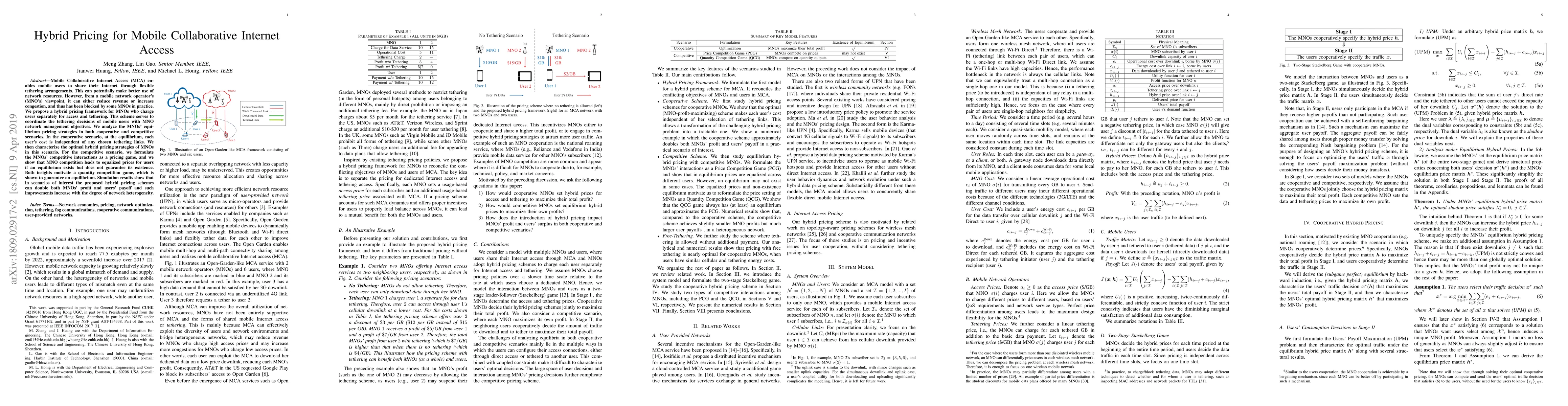 This paper proposes a hybrid pricing framework for Mobile Collaborative Internet Access (MCA) to optimize network resource usage while balancing mobile network operators' (MNOs) revenue and congestion concerns. The study analyzes equilibrium pricing strategies in cooperative and competitive MNO scenarios, showing that hybrid pricing can significantly enhance MNO profits and user payoffs, especially in heterogeneous networks.