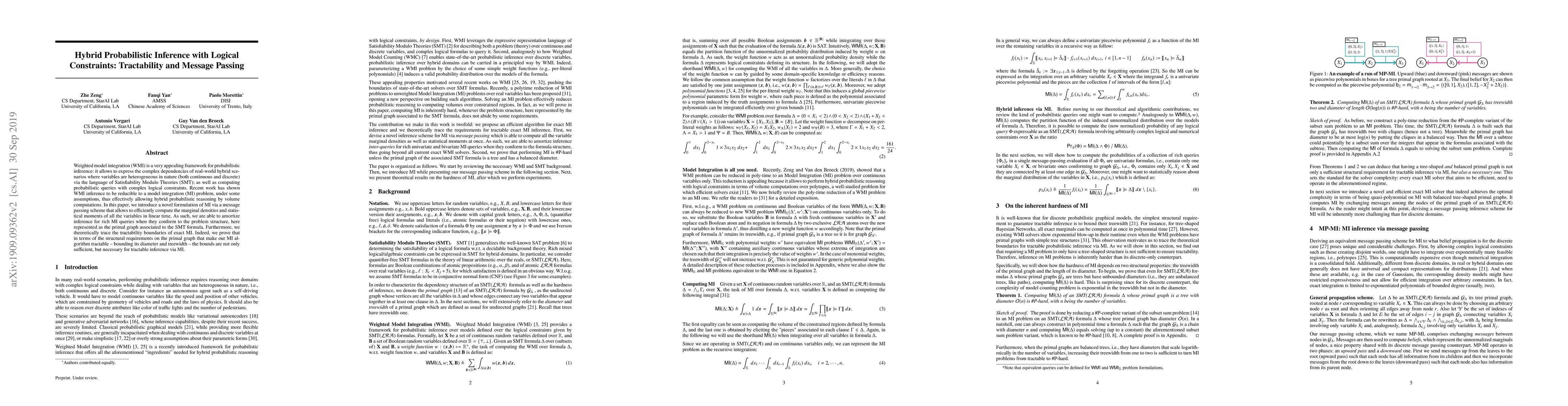 This paper proposes a novel message passing scheme for model integration (MI) to efficiently compute marginal densities and statistical moments in hybrid probabilistic inference, demonstrating linear-time computation. It also establishes the necessary structural conditions on the primal graph for tractability, proving that bounds on its diameter and treewidth are both sufficient and necessary for efficient inference.