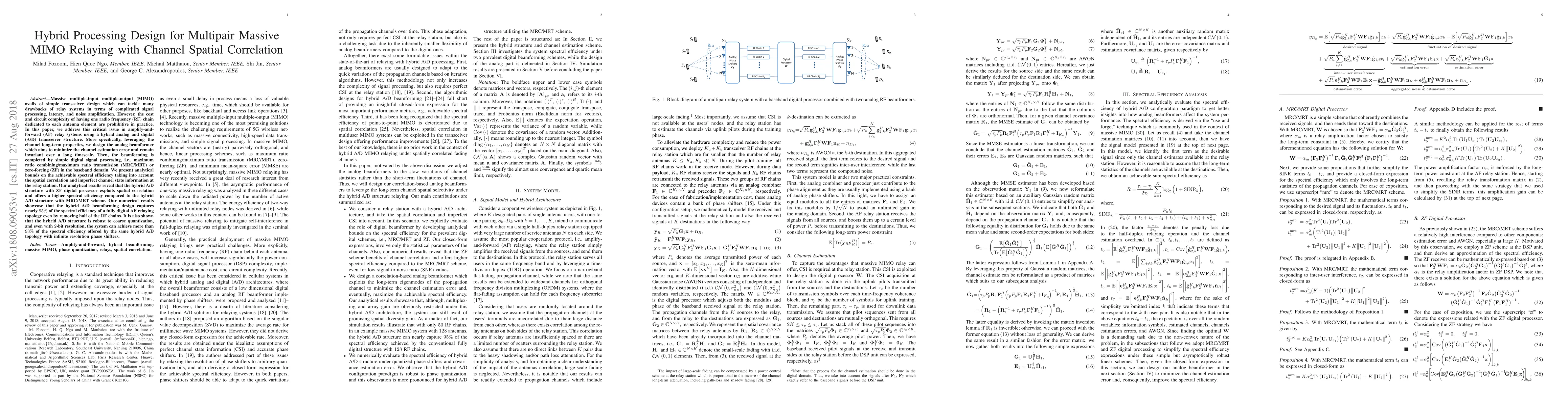 This paper proposes a hybrid analog-digital (A/D) transceiver design for multipair massive MIMO relaying to address high circuit complexity. The hybrid approach uses an analog beamformer for long-term channel spatial correlation and digital signal processing for beamforming, achieving nearly 95% of the spectral efficiency of a fully digital system while reducing the number of RF chains by half.