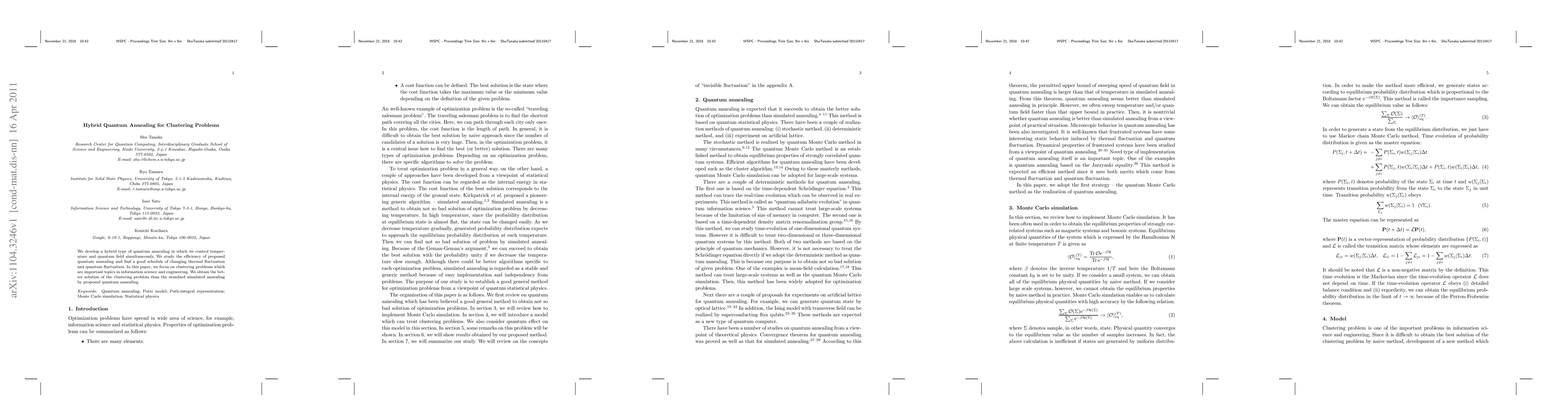 This paper introduces a hybrid quantum annealing method that simultaneously controls temperature and quantum field, demonstrating improved efficiency for clustering problems compared to standard simulated annealing. The study finds an optimal schedule for balancing thermal and quantum fluctuations to achieve better clustering solutions.