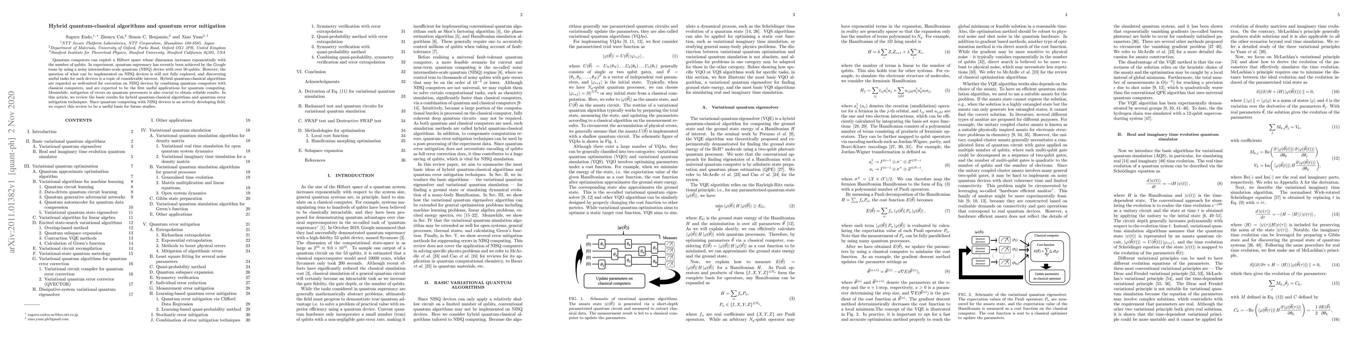 Quantum computers can exploit a Hilbert space whose dimension increases exponentially with the number of qubits. In experiment, quantum supremacy has recently been achieved by the Google team by using a noisy intermediate-scale quantum (NISQ) device with over 50 qubits. However, the question of what can be implemented on NISQ devices is still not fully explored, and discovering useful tasks for such devices is a topic of considerable interest. Hybrid quantum-classical algorithms are regarded as well-suited for execution on NISQ devices by combining quantum computers with classical computers, and are expected to be the first useful applications for quantum computing. Meanwhile, mitigation of errors on quantum processors is also crucial to obtain reliable results. In this article, we review the basic results for hybrid quantum-classical algorithms and quantum error mitigation techniques. Since quantum computing with NISQ devices is an actively developing field, we expect this review to be a useful basis for future studies.